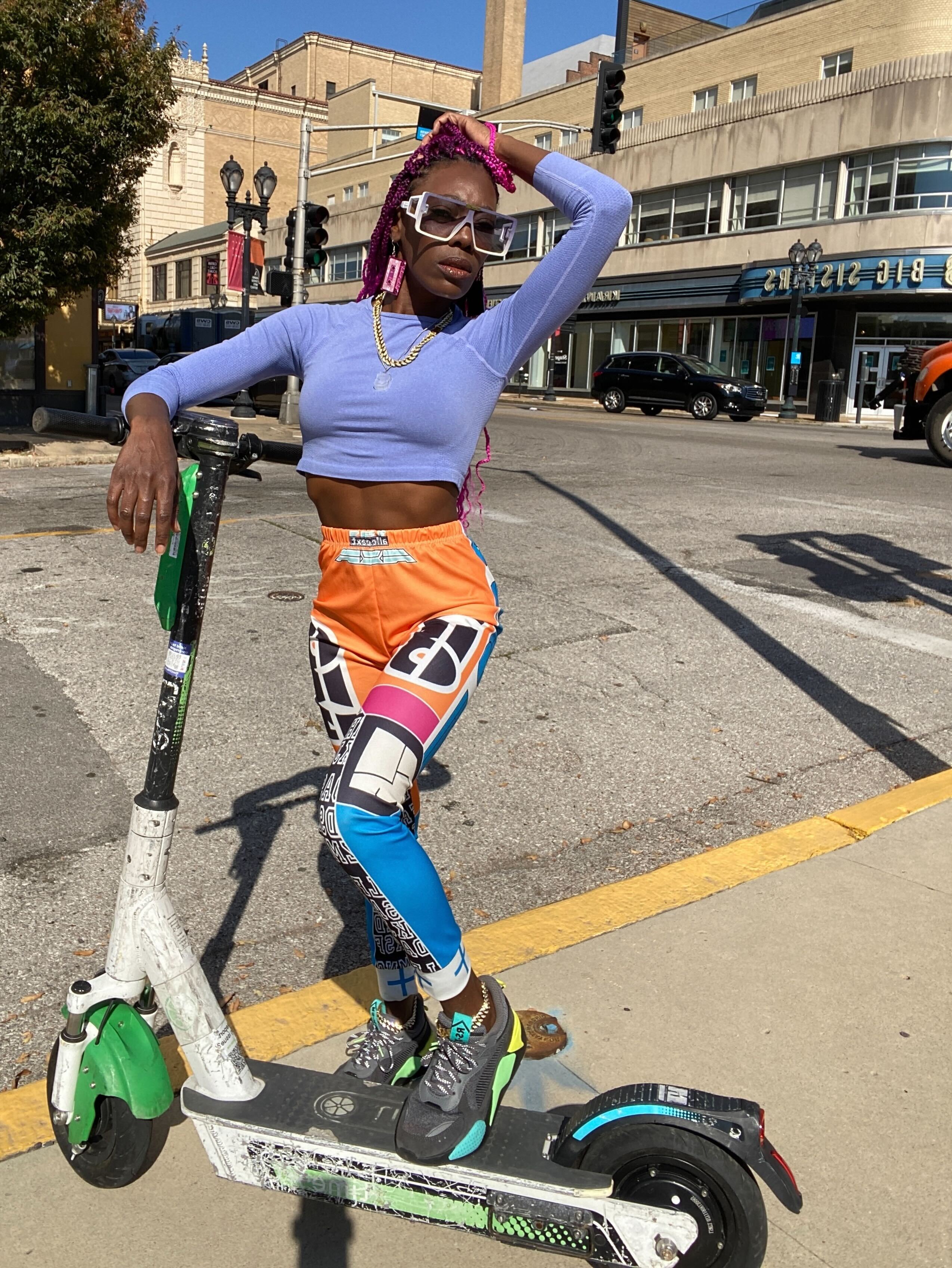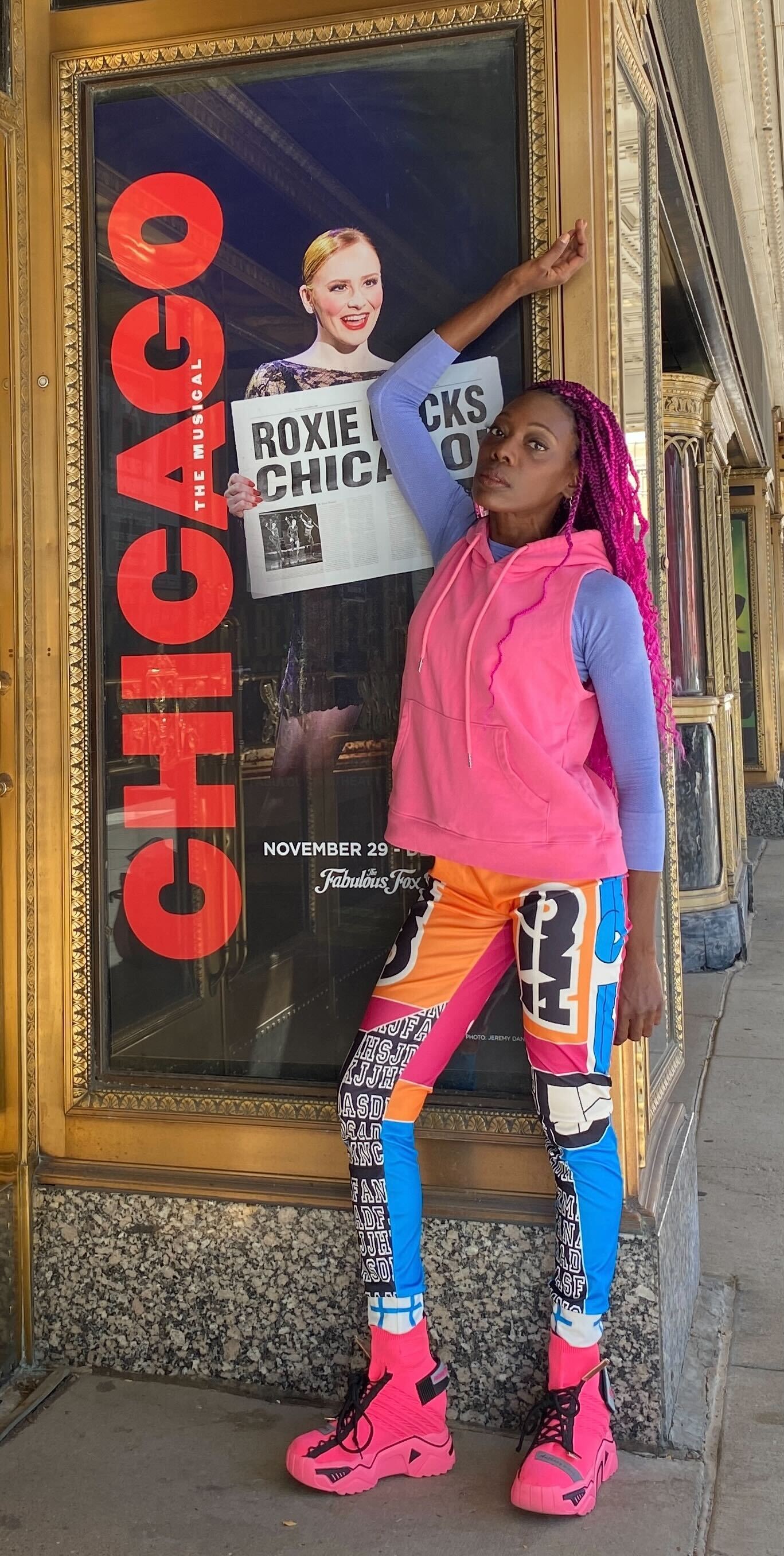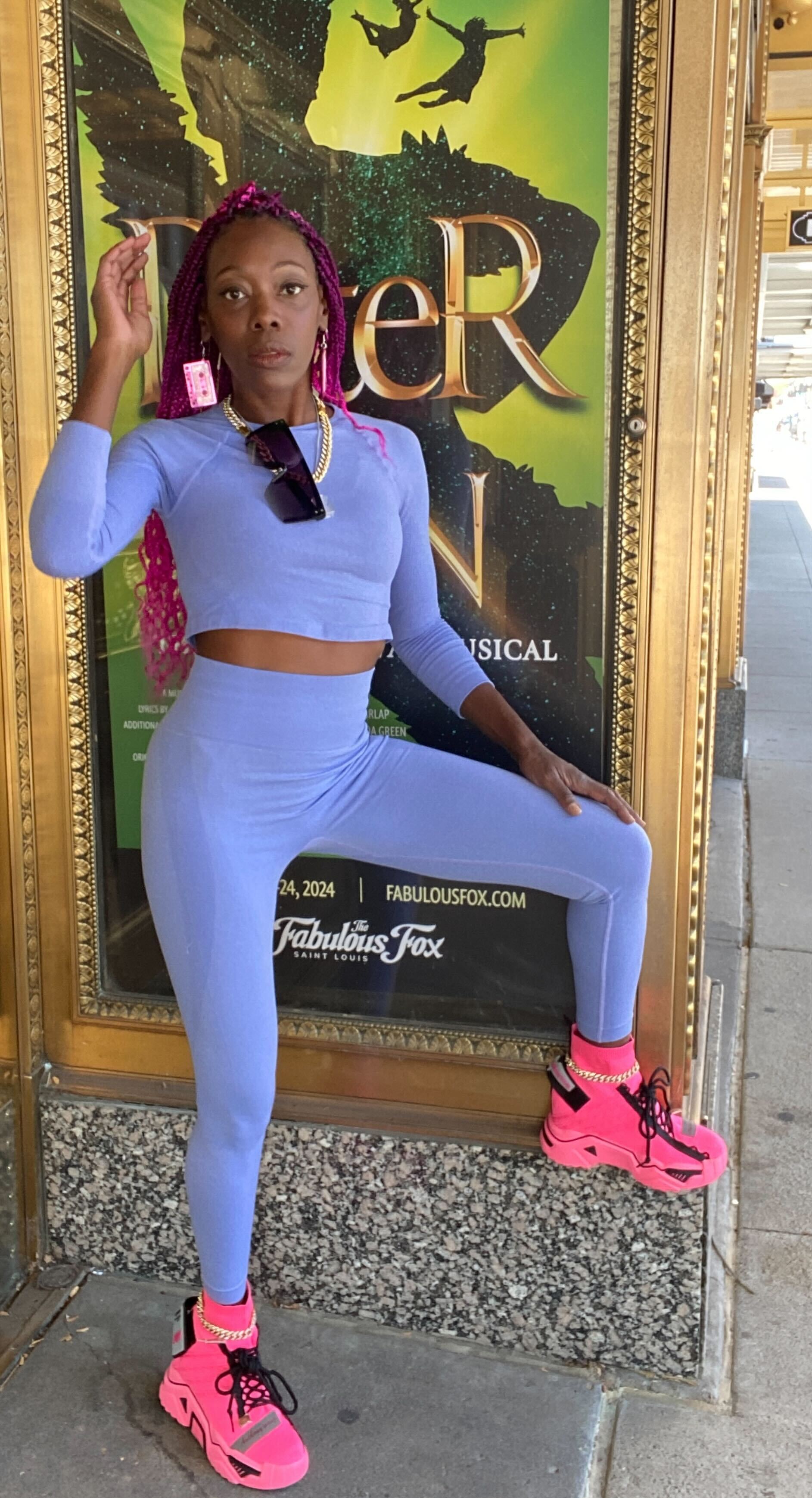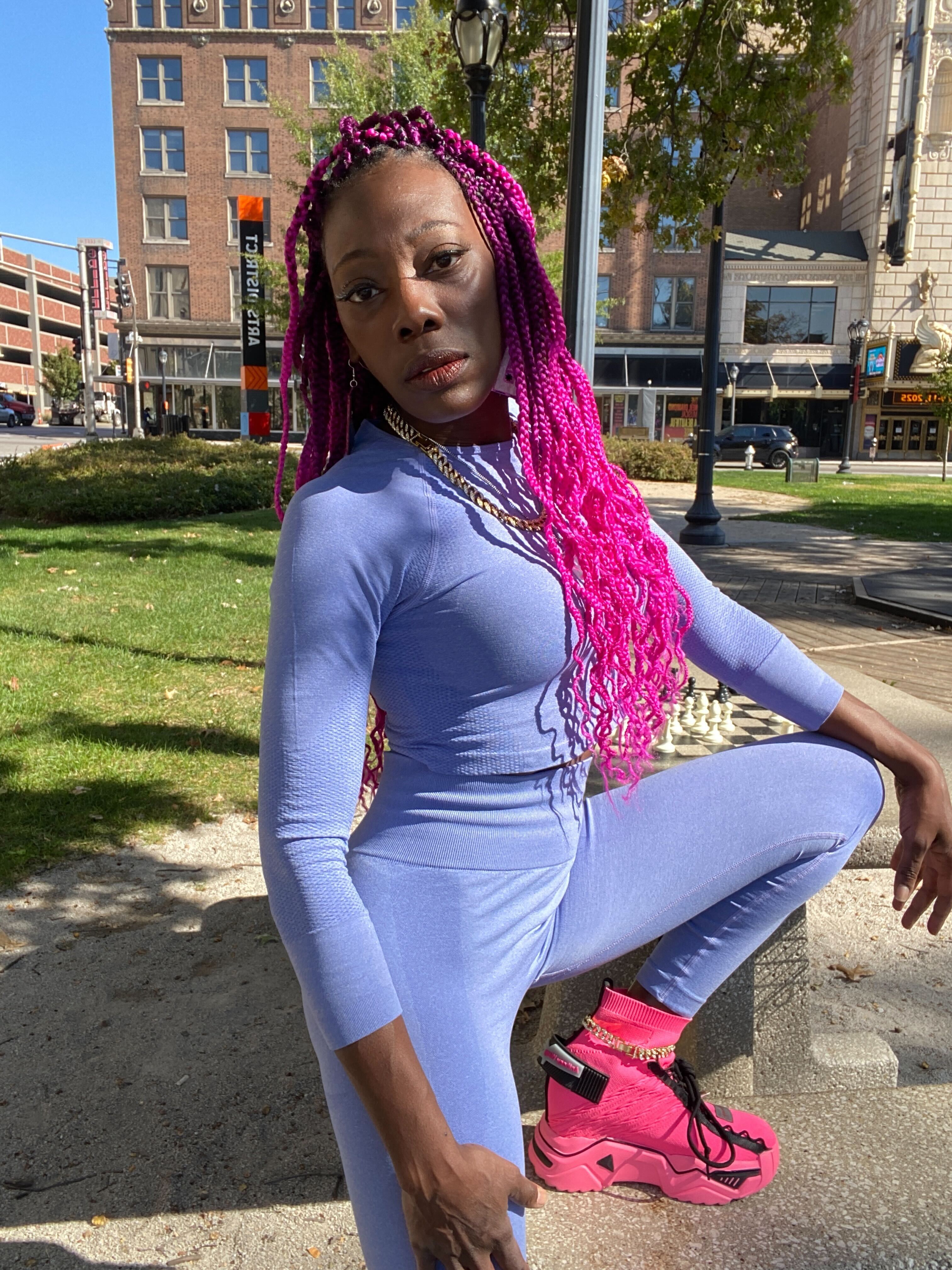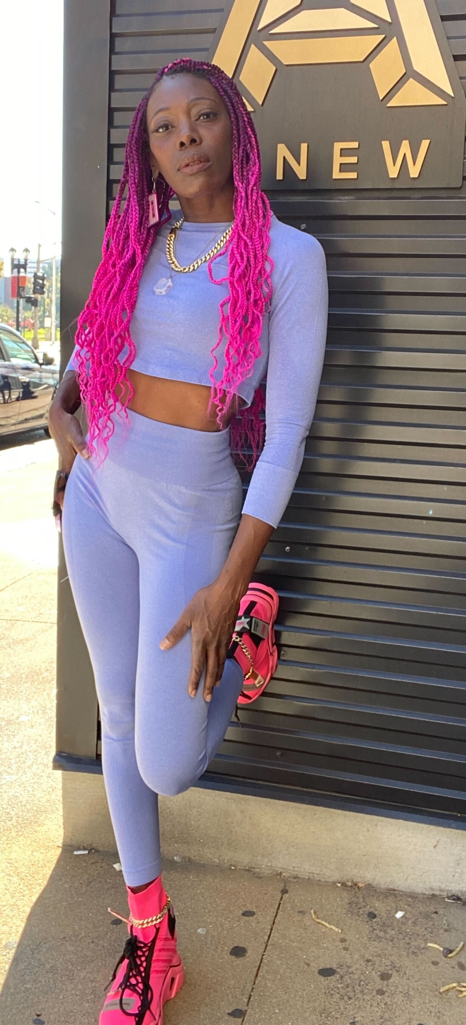 For a less flashy look, I opt for monochromatic ensembles like this sleek blue outfit. Combining subtle yet powerful pinks in my hair and accessories, the outfit is simple yet chic.