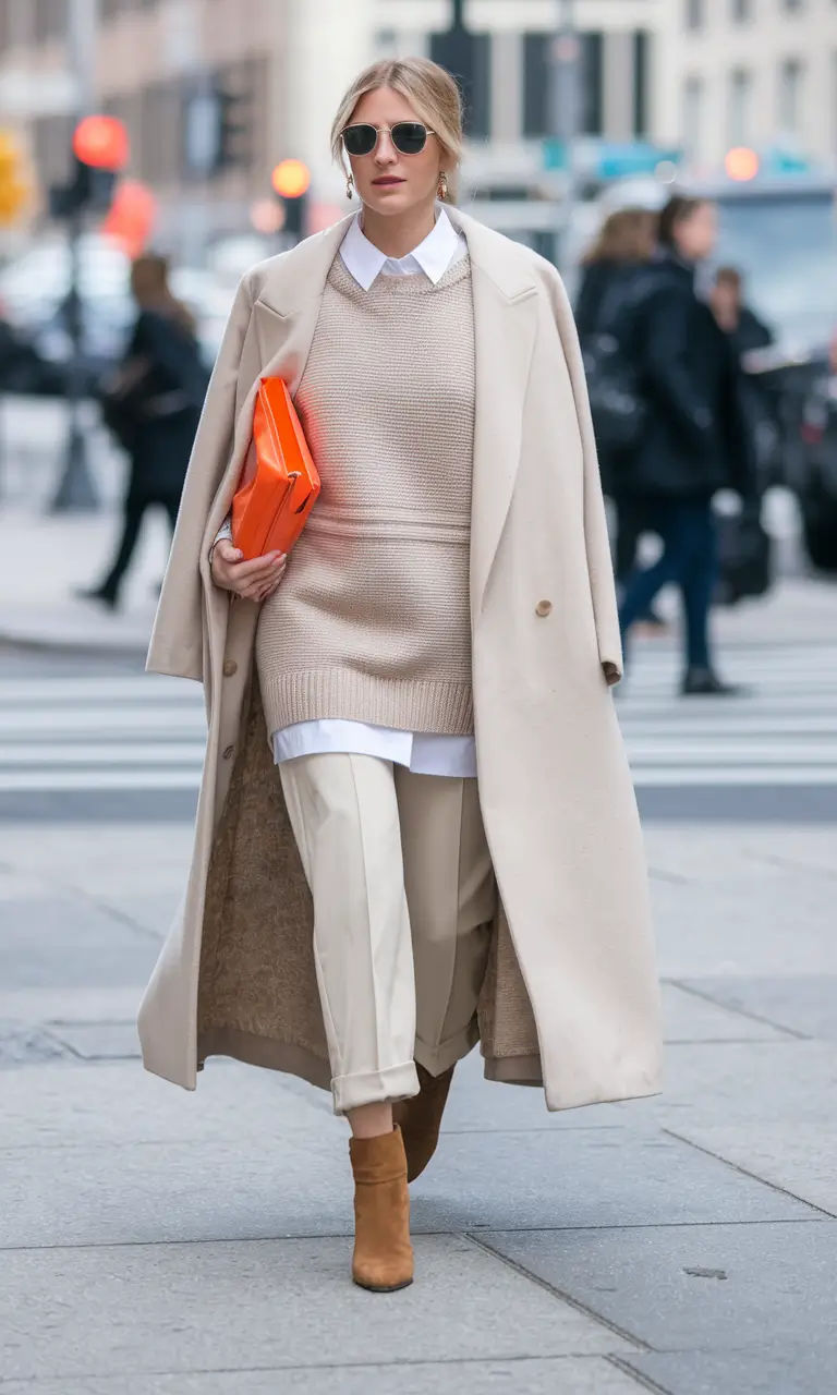 3) Mix lengths: Long coats over short knits prevent boxiness.