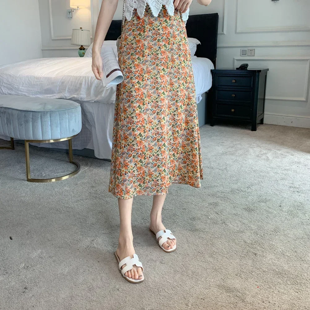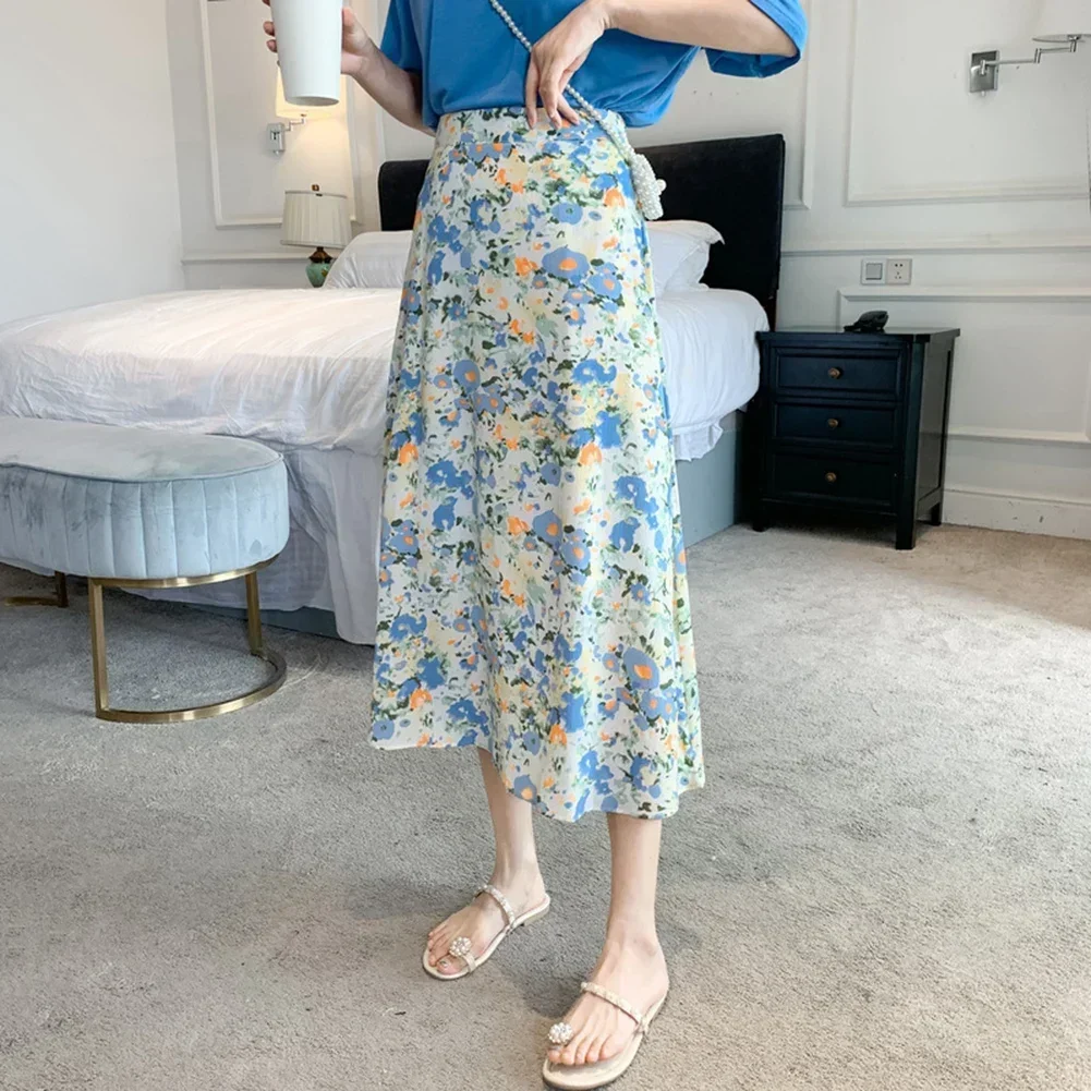 New Women Summer Vintage Japanese Floral A-Line Pleated Long Skirts Korean High Rise Skirt Oil Painting Beach Female Half Skirt