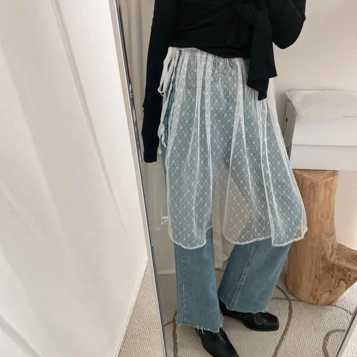 Hot Sale!Korean See Through Lace Wrap Skirt Women's Stacked Skirt Matching Pants Dress Lace Fart Curtain Cover up Mesh Skirt Y2K