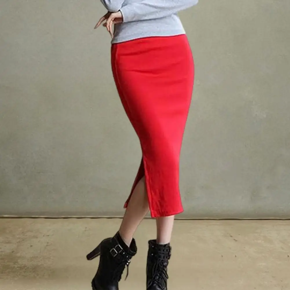Fashion Midi Skirt Mid-rise Back Split Design Solid Color Knitting Skirt Hip Wrapped Office Womens Skirt Workwear