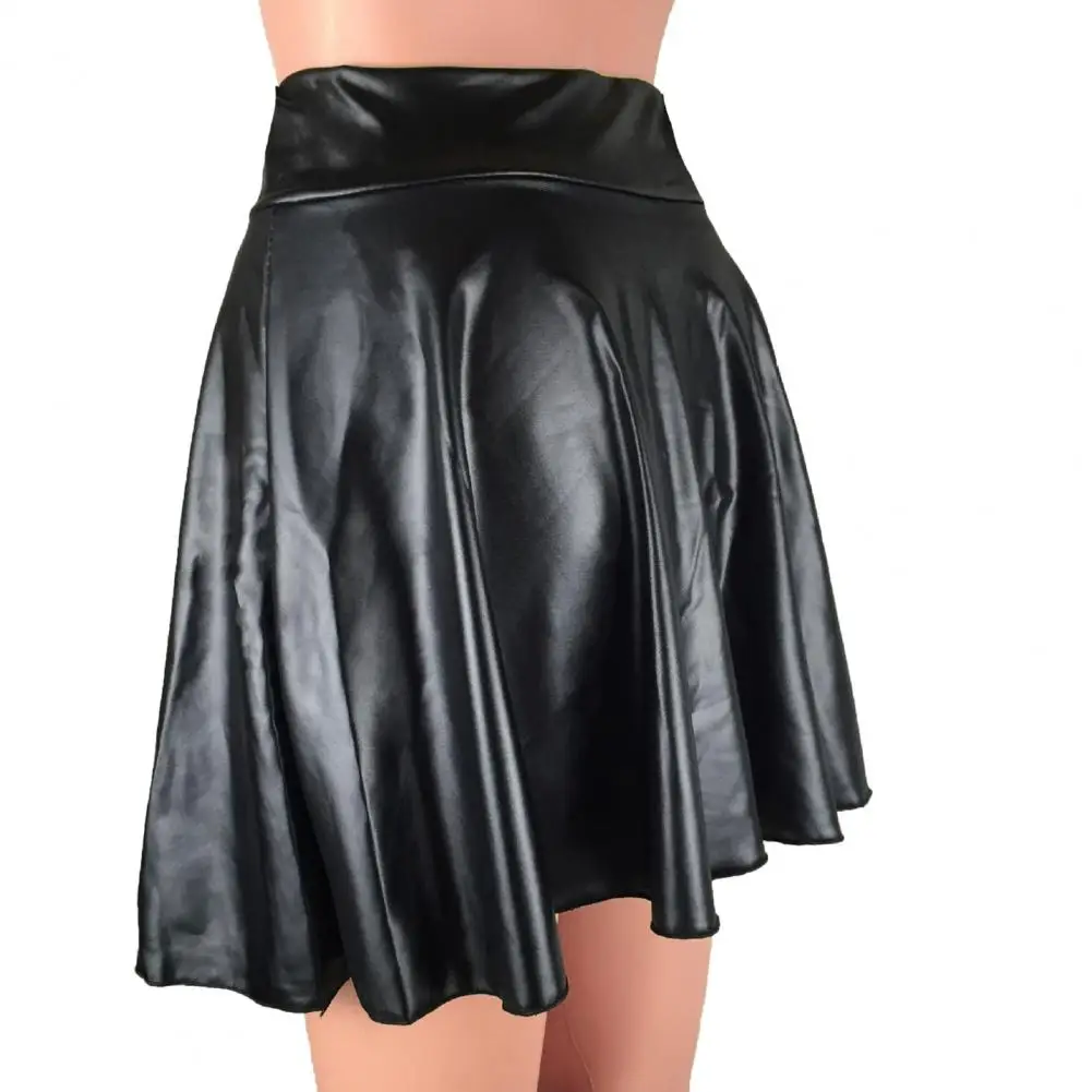Pleated Skirt High Elastic Waist Faux Leather A-line Mini Skirt for Women Solid Color Pleated Club Skirt with Soft Texture Above