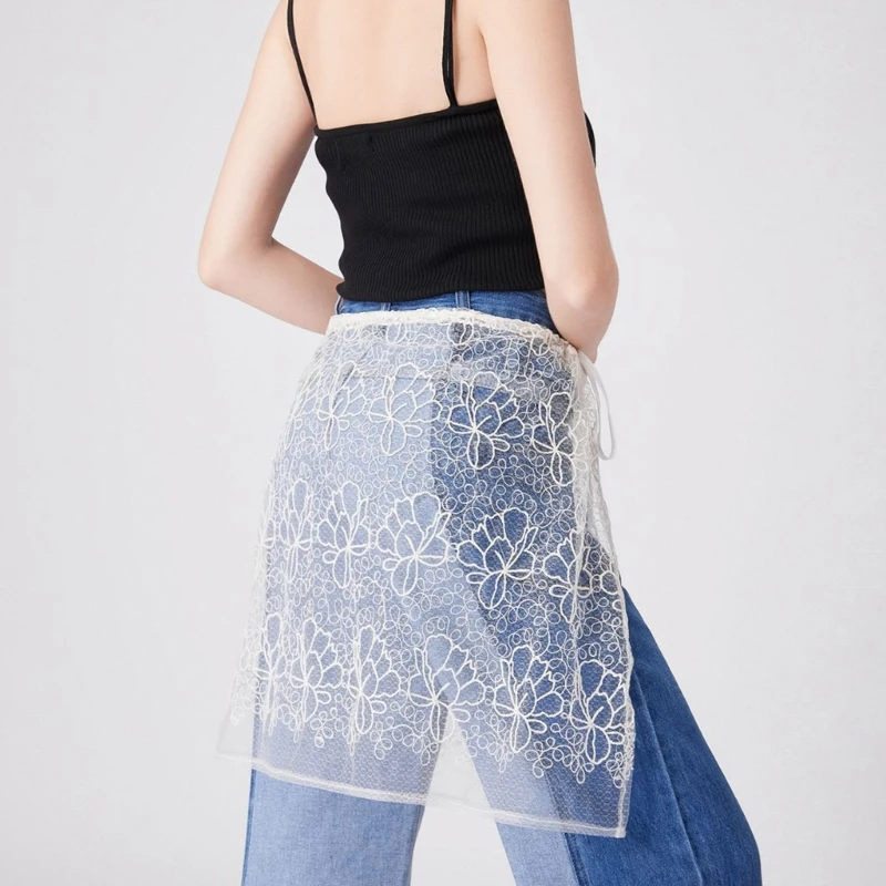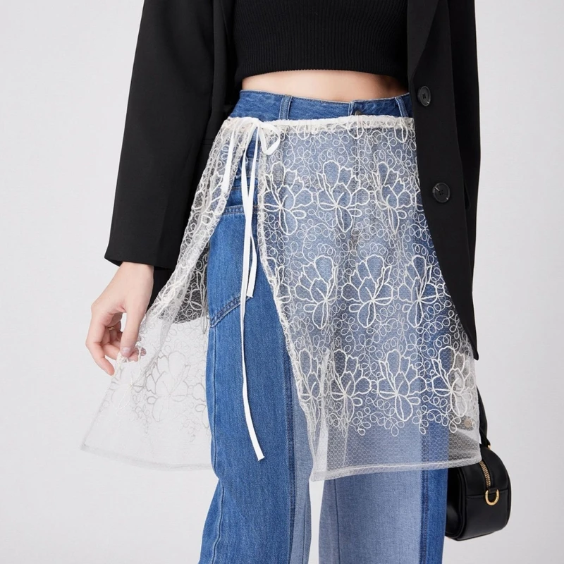 Korean See Through Half Skirt for Women Flower Lace Sheer Hip Wrap Covering Apron Skirt Lace Up Bandage Bows Overskirt Dropship