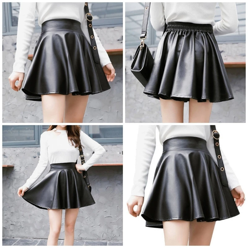 Womens Autumn PU Faux Leather Elastic High Waist A-Line Short Skirt Solid Color Pleated Flared Casual Mini Dropship