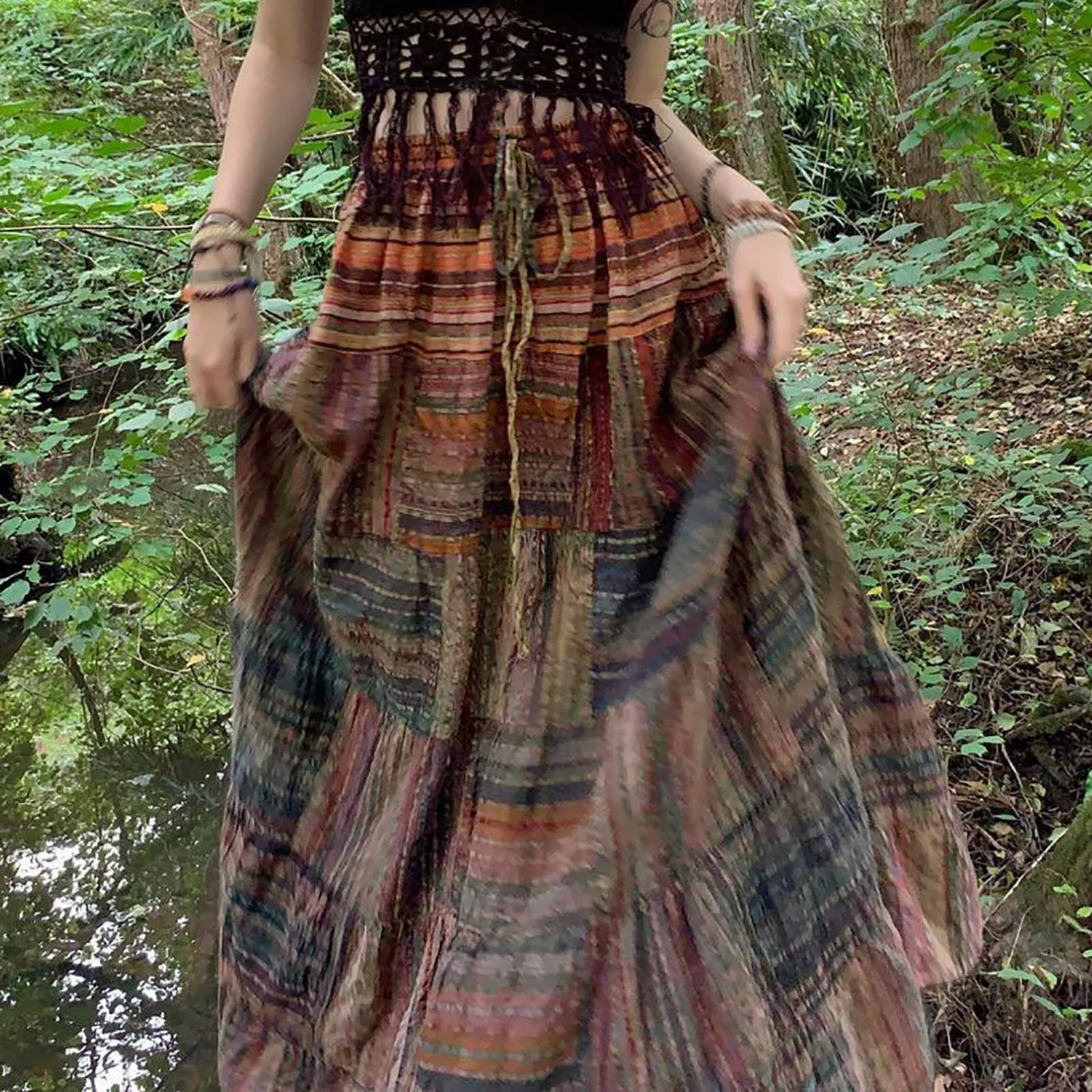 Women's Vintage Classic Halter Women's Loose All-match Coffee Printed Lace-Up Halter Skirt Large Hem Pleated Skirt Long Skirt