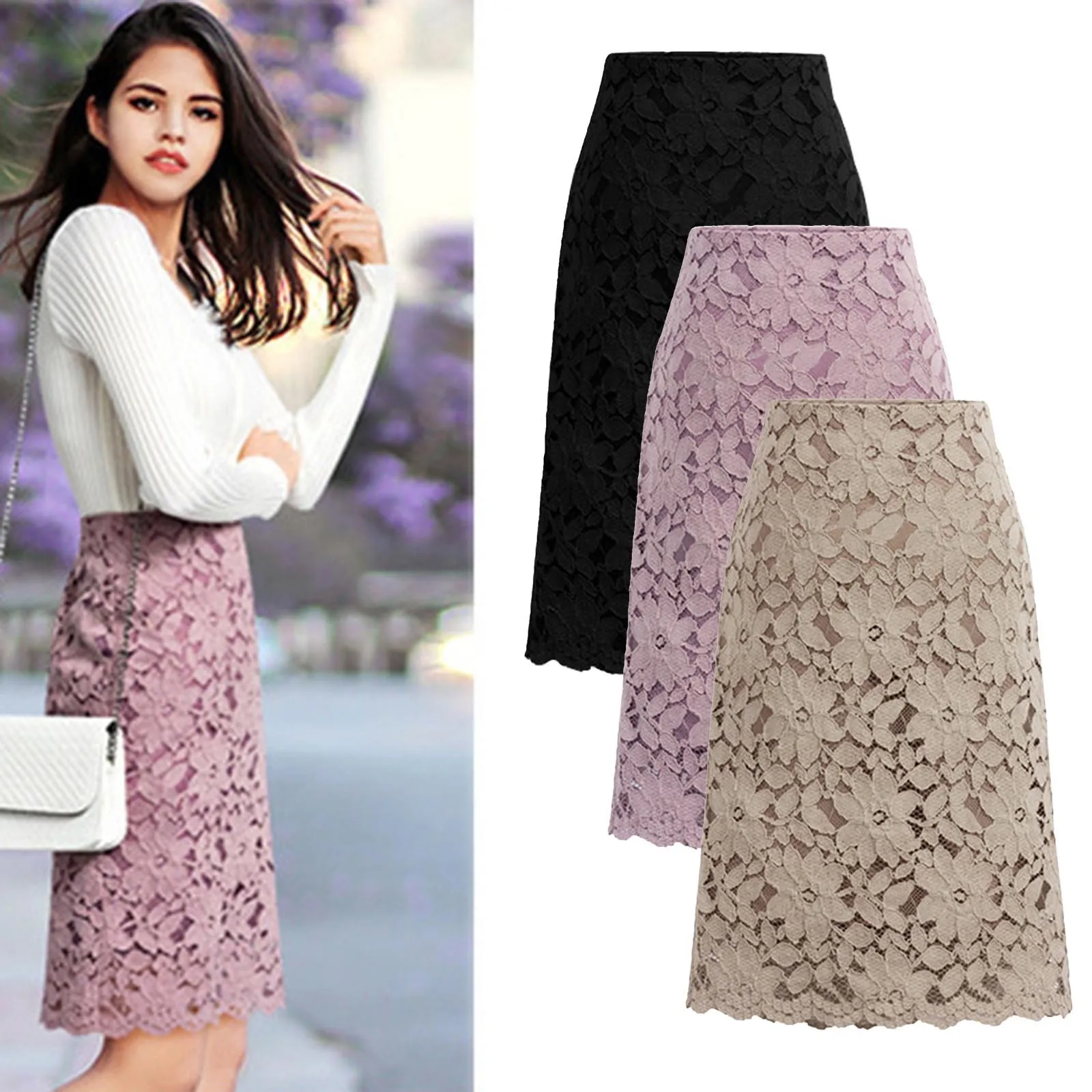 Women Skirt Elegant Lace Midi Skirt Slimming Tight Fit Skirt High Waist Knee Length Skirt Solid Color Office Lady Outfits