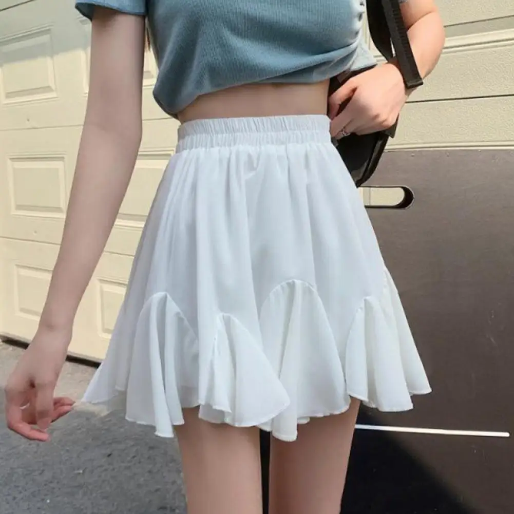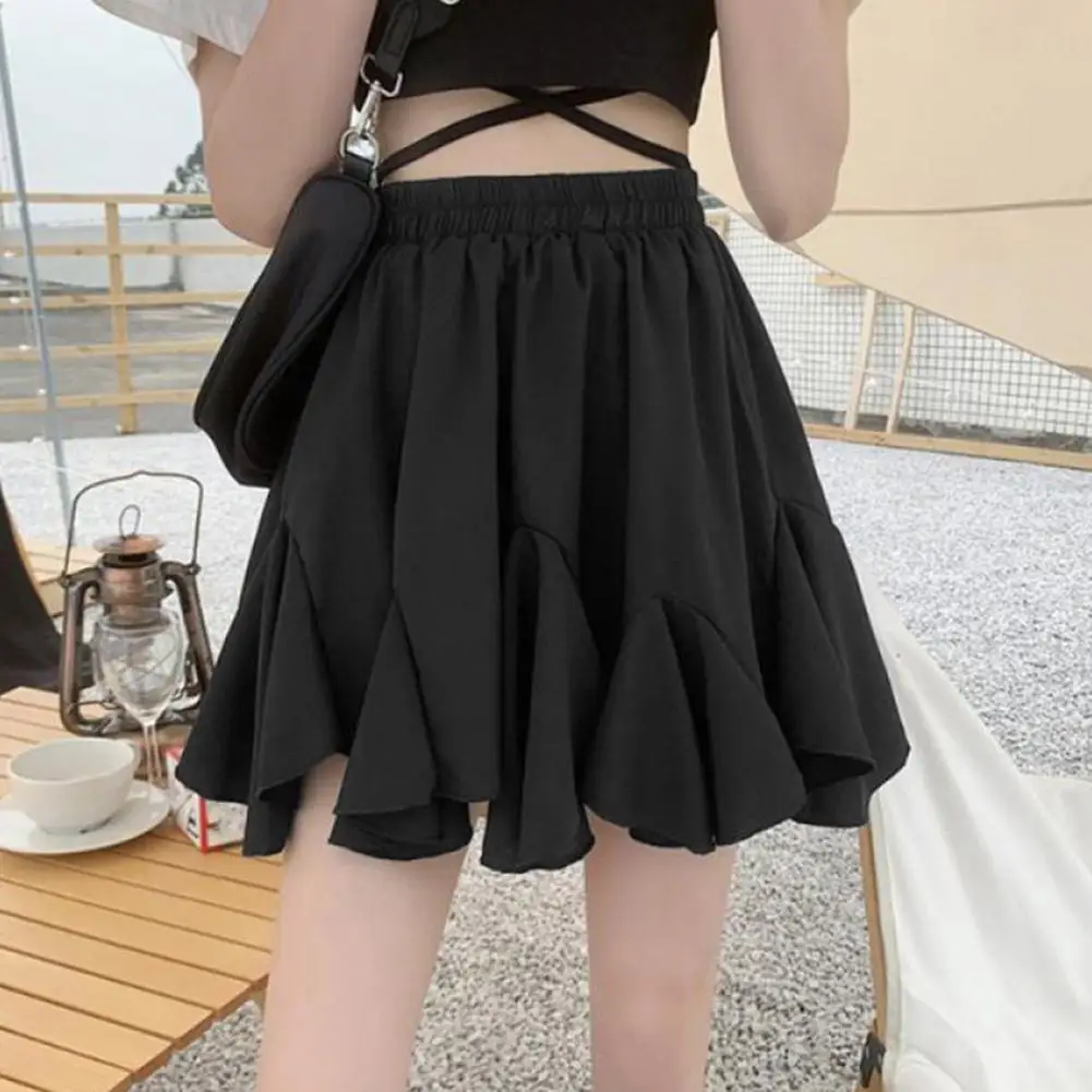 Elegant Women Mini Skirt Elastic High Waist Puffy Ruffled Stitching Hem Short Skirt Solid Color A-Line Skirt Summer