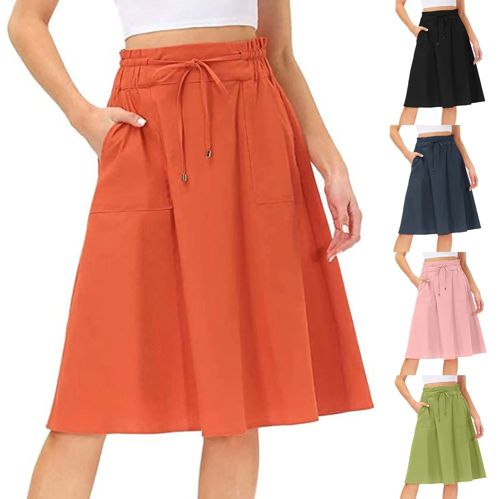 Women's Half Skirt Casual Solid Color Skirt Drawstring Elastic Waist A Line Skirt Loose Large Size Versatile Skirt With Pockets