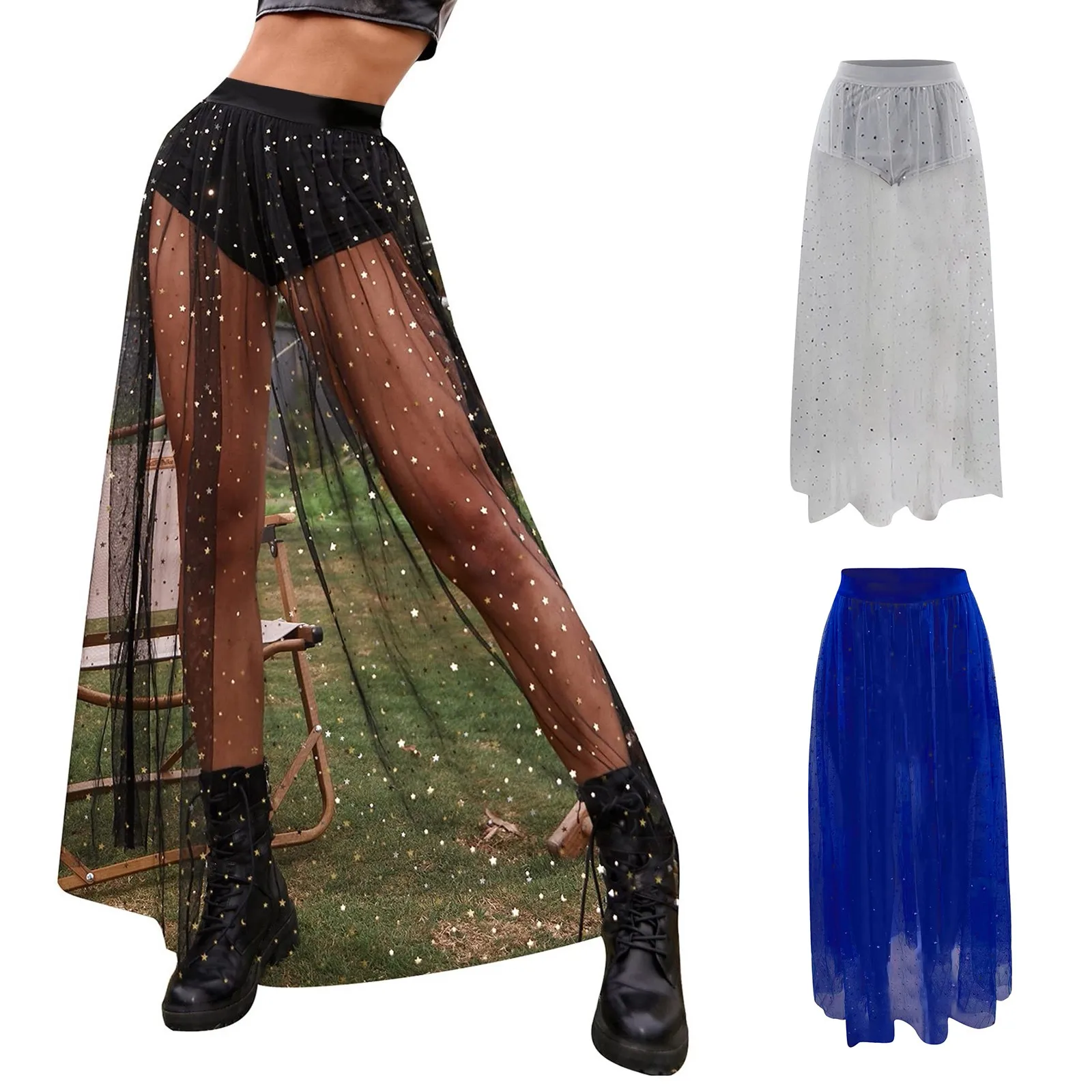 Women Sexy Mesh Patchwork See Through Skirt Fashion High Waist Pleated Bottom Half Body Skirt Sequins Decoration Wrap Hip Skirt