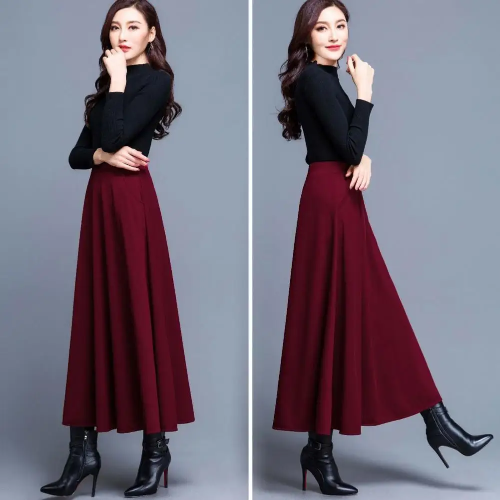 Elastic Waist Large Hem Side Pockets Korean Style Midi Skirt Autumn Winter Lady Solid Color High Waist A-Line Long Skirt Female