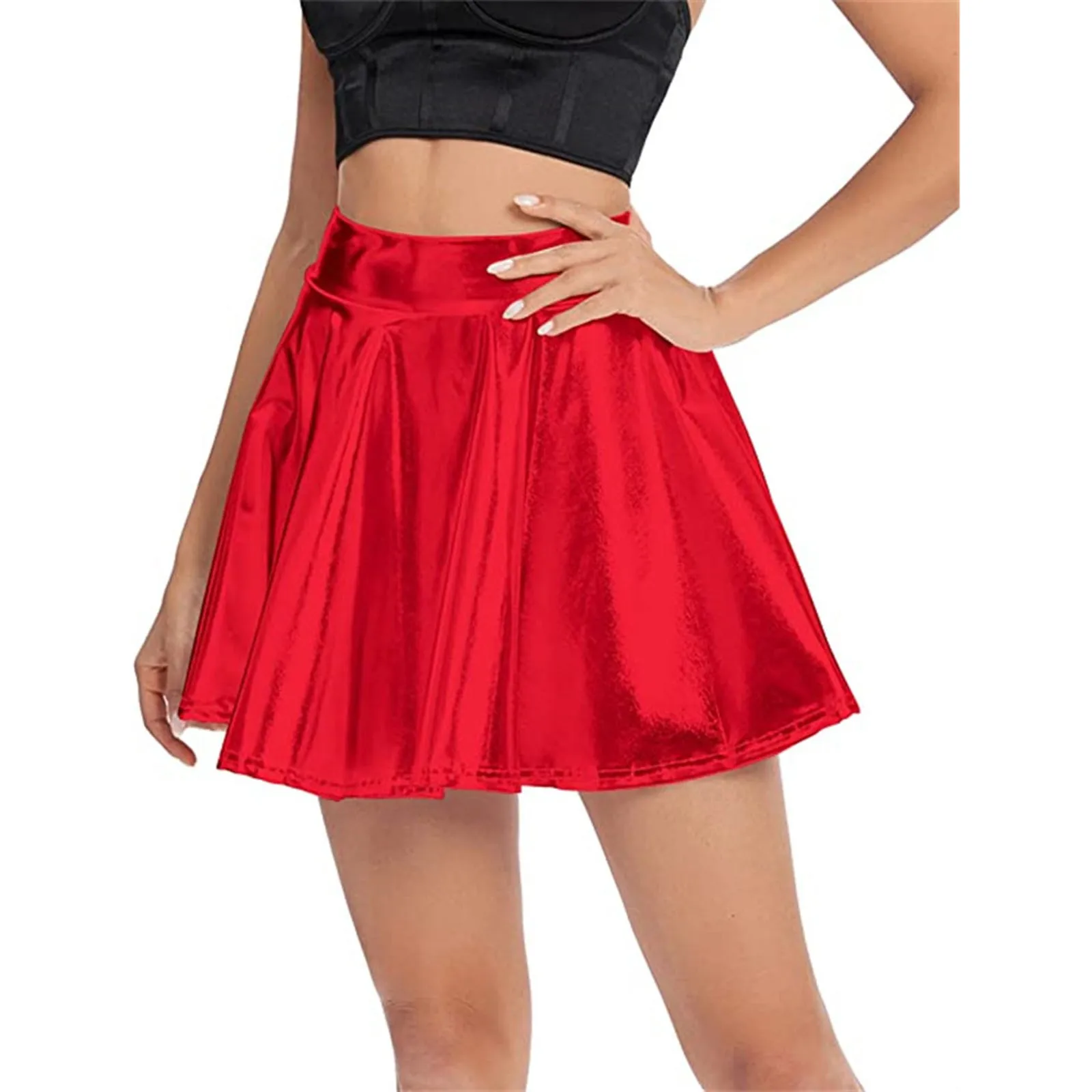 Women's Solid Shiny Pleated Mini Skirt Fashionable High Waist Dancing Party Multiple Color Options Dance Short Dress For Woman