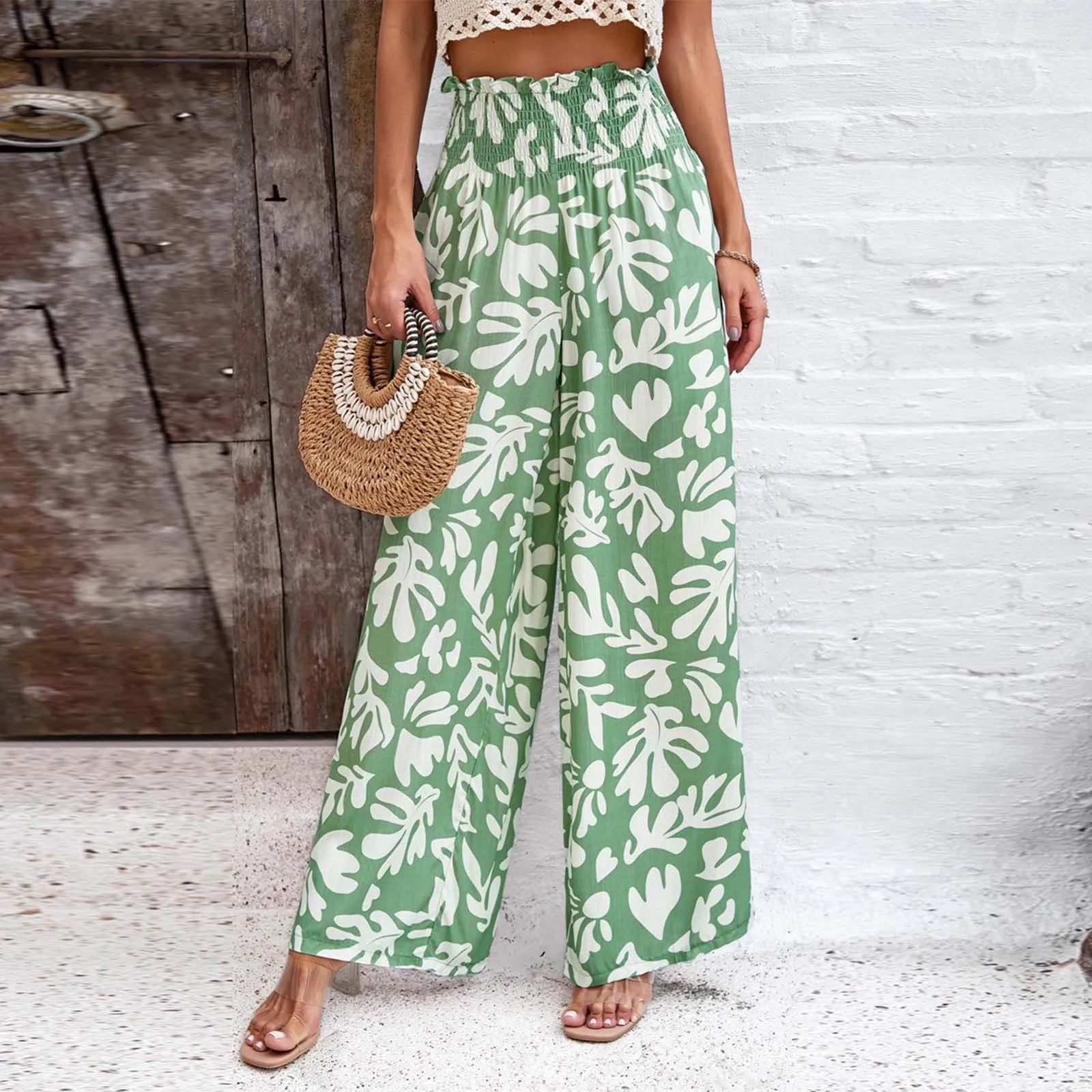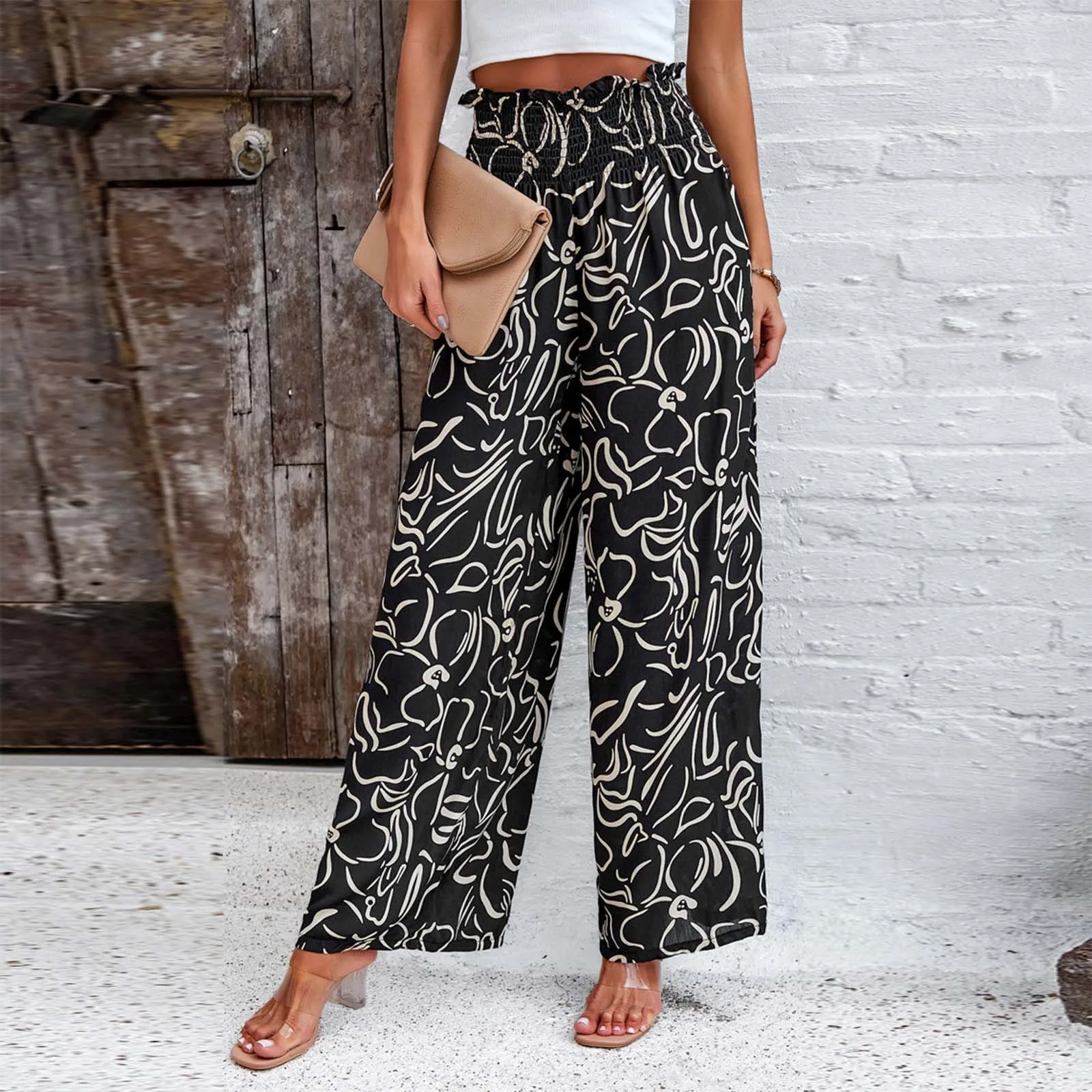 Women's Spring And Summer Elegant Temperament Printed Loose Long Pants High Elastic Waisted Wide Leg Casual Pants With Pockets