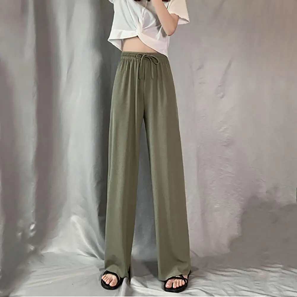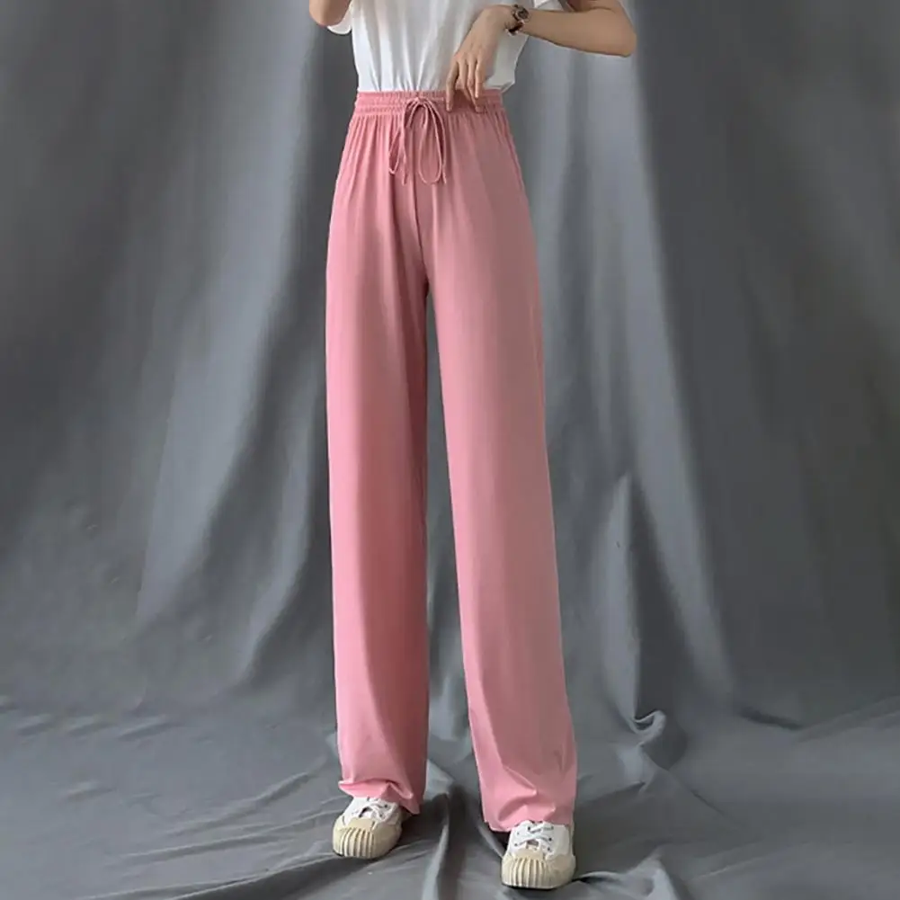 Women High Waisted Wide Leg Pants Stylish Women's Ice Silk Wide Leg Pants with Adjustable Drawstring High Waist Solid for Daily
