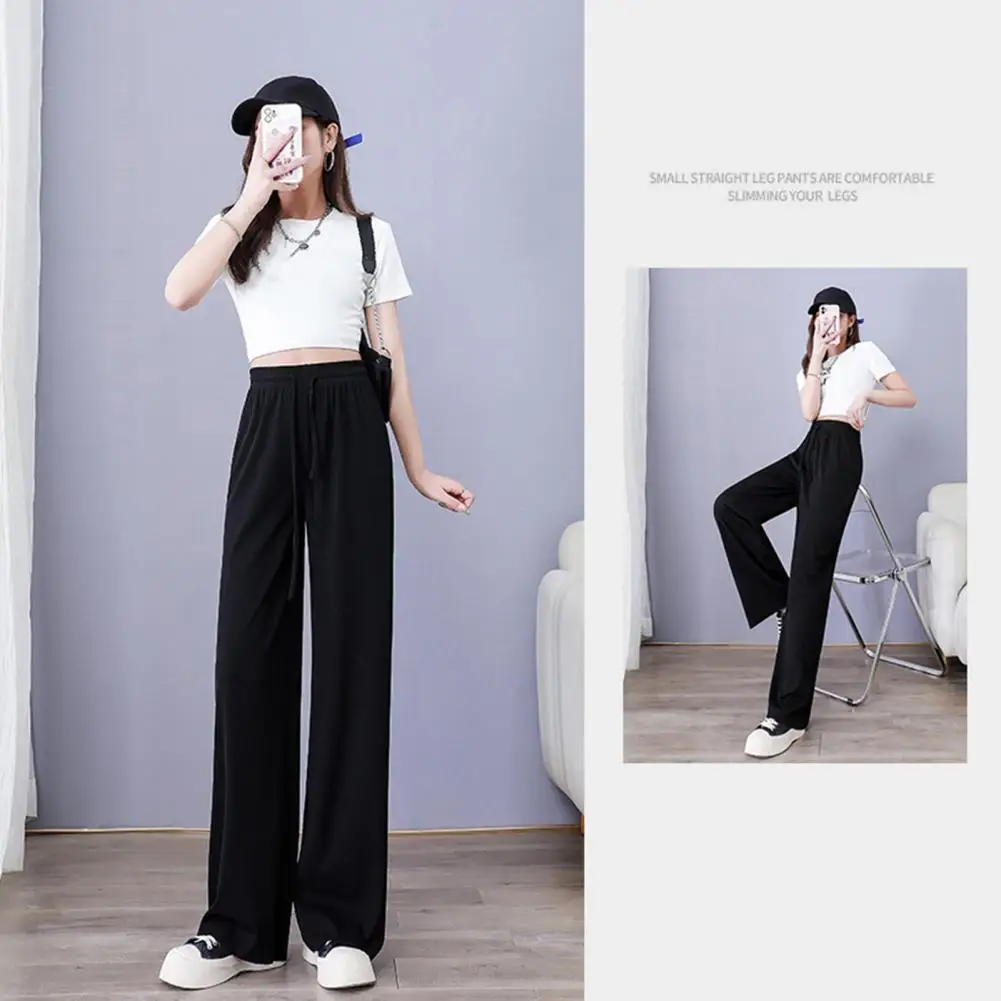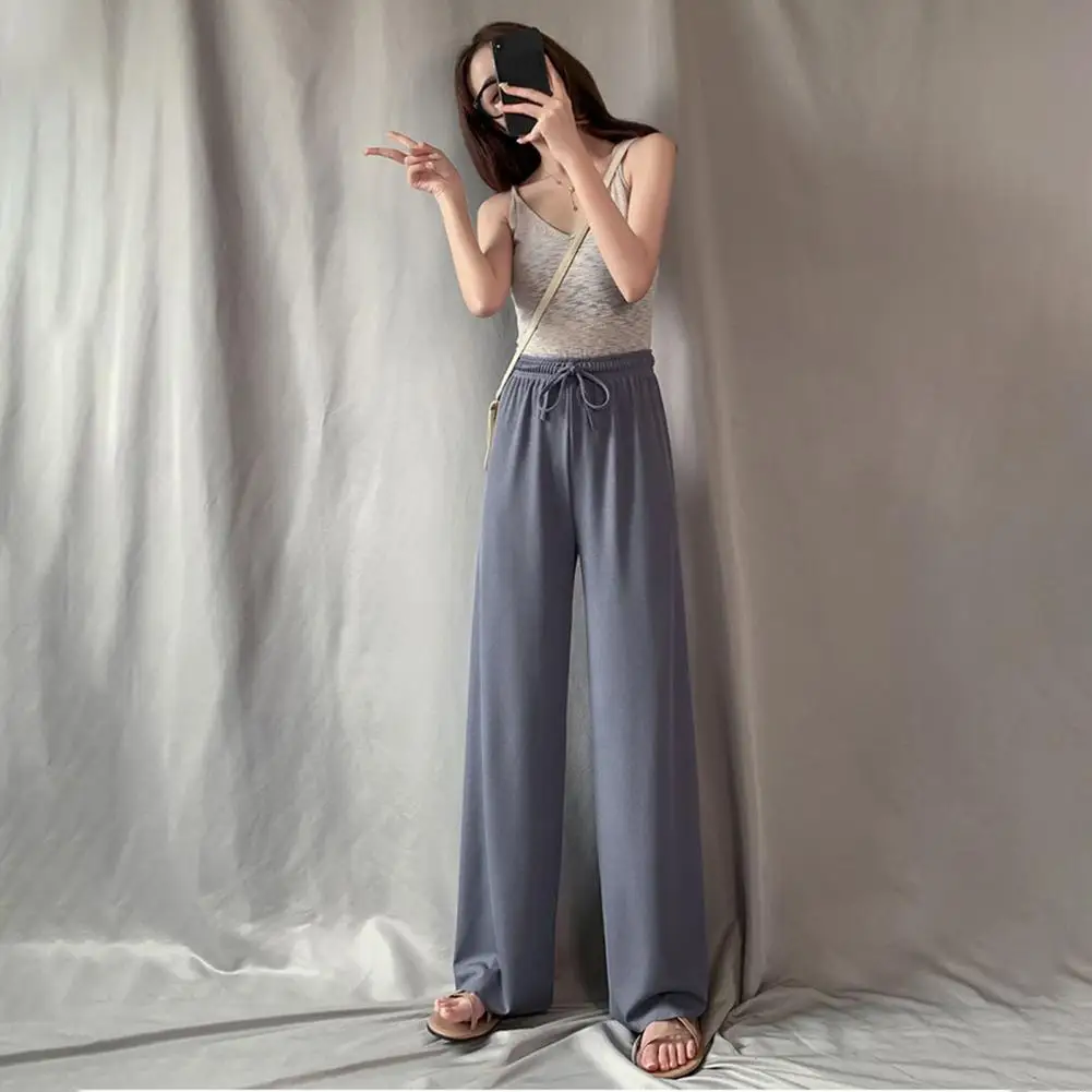 Sexy Wide Leg Pants Stylish Women's Ice Silk Wide Leg Pants with Adjustable Drawstring Elastic Waist for Comfortable Daily Wear