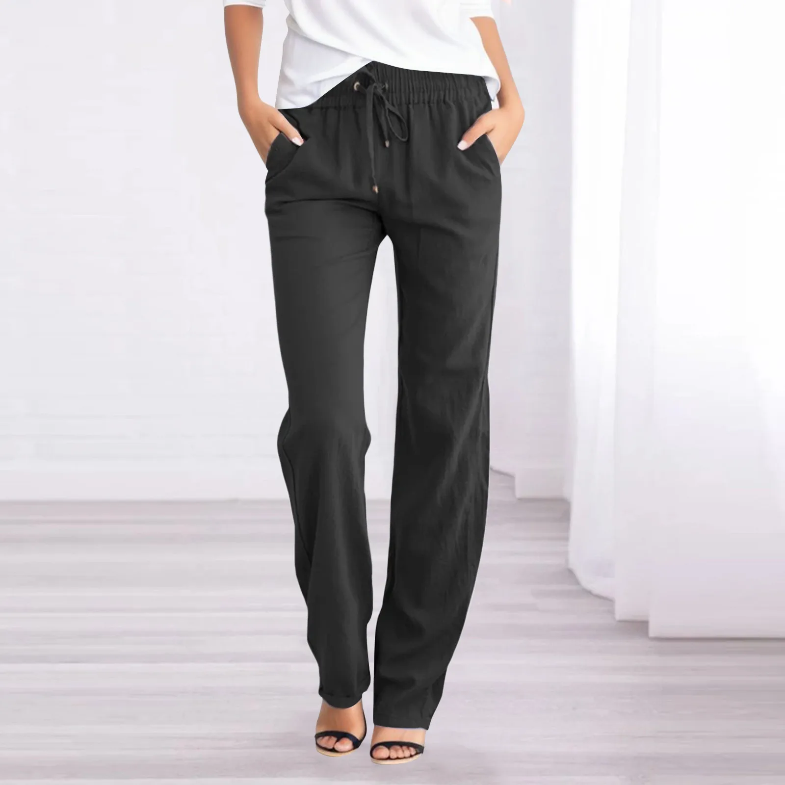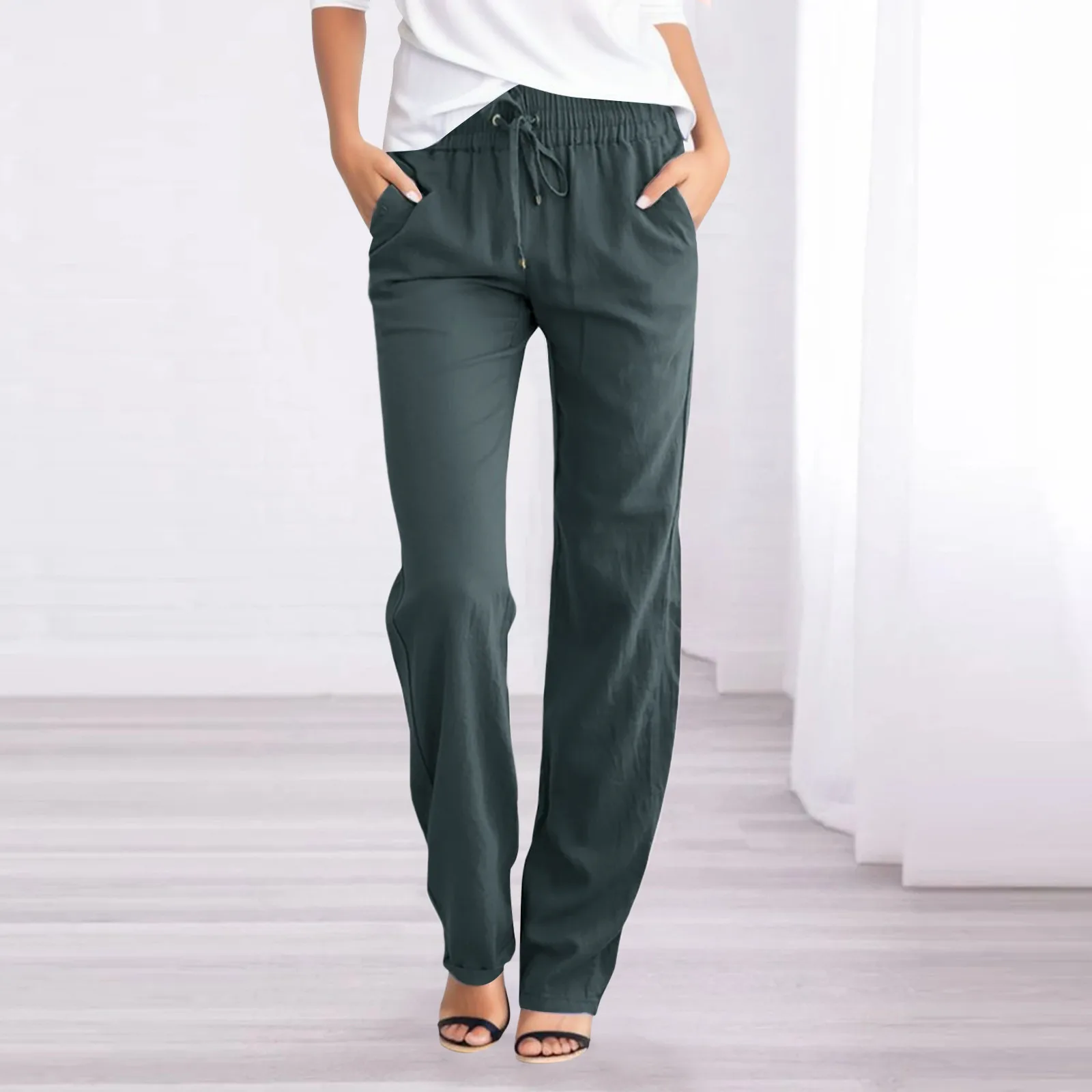 Women'S Solid Color Casual Pants Cotton And Linen Comfortable Loose Wide Leg Pants With Drawstring And Double Pocket Casual Pant