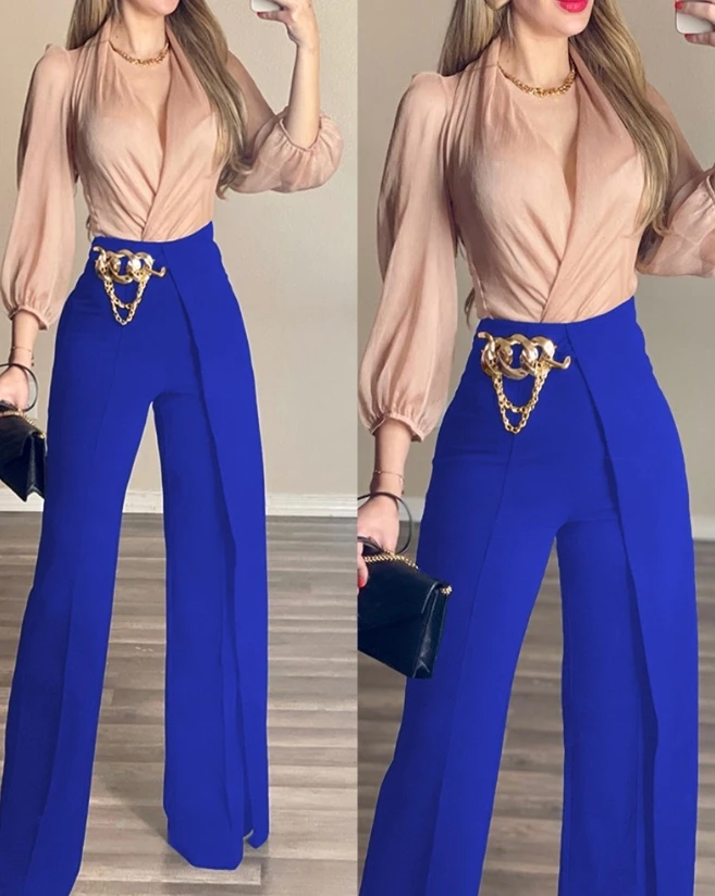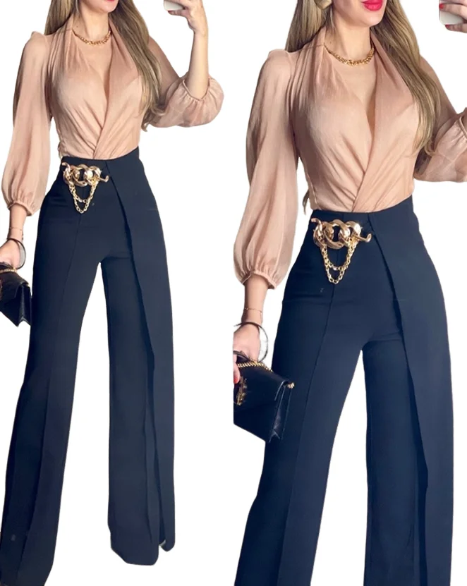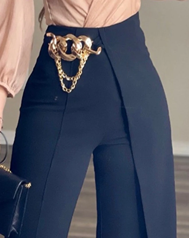 Name | Women's Temperament Commuter 2023 Autumn New Fashion Casual High Waist Elegant Chain Decor Fake Two Piece Work Pants Office Lady |