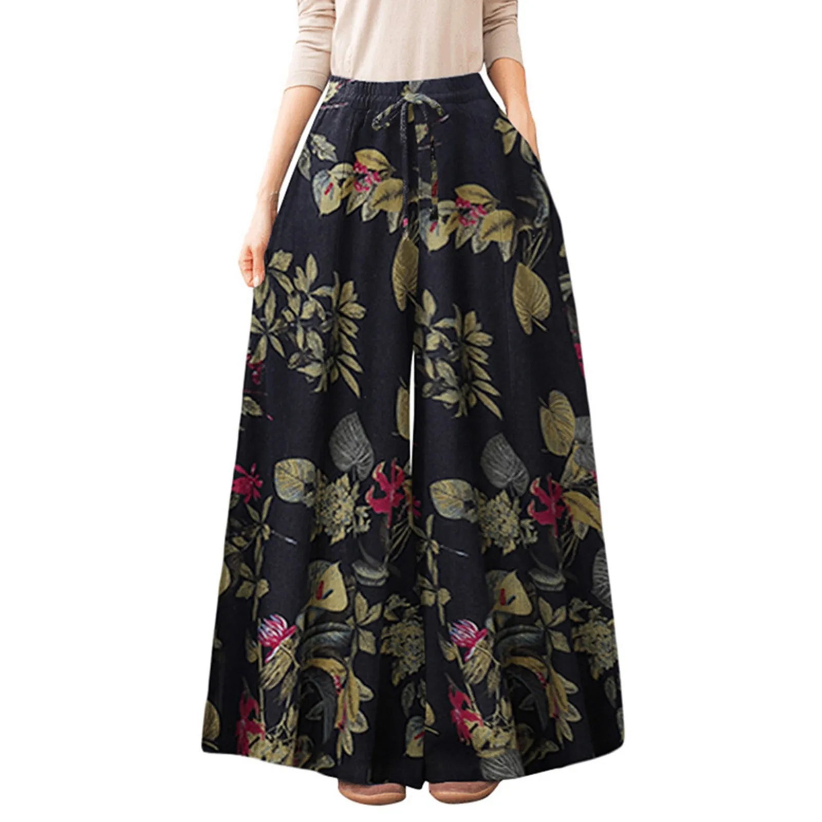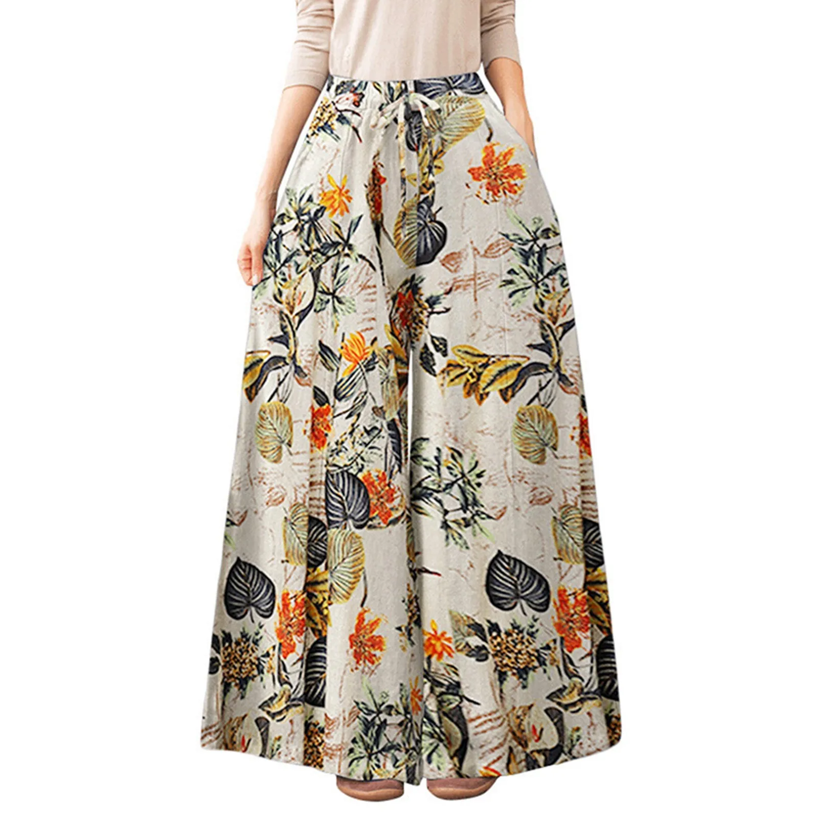 Women Casual Cotton Linen Pants Oversized High Waist Drawstring Floral Trousers Vintage Fashion Loose Wide Leg Pants Streetwear