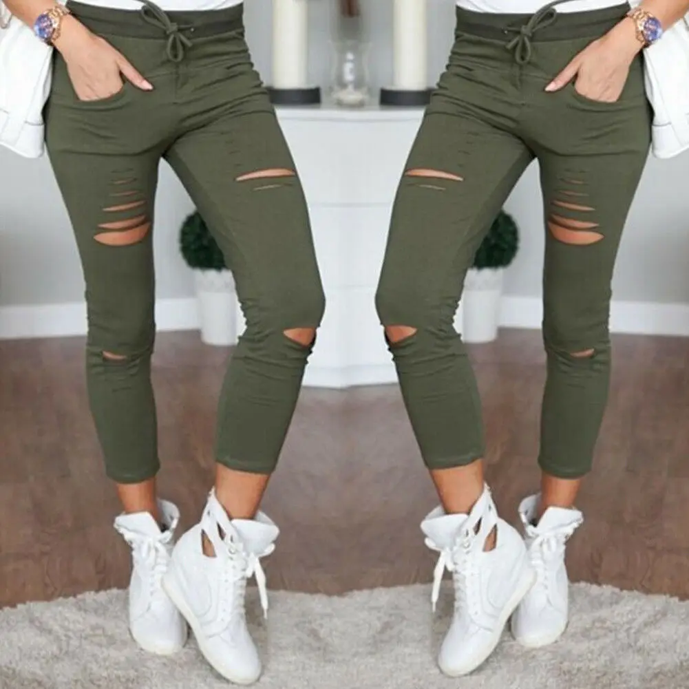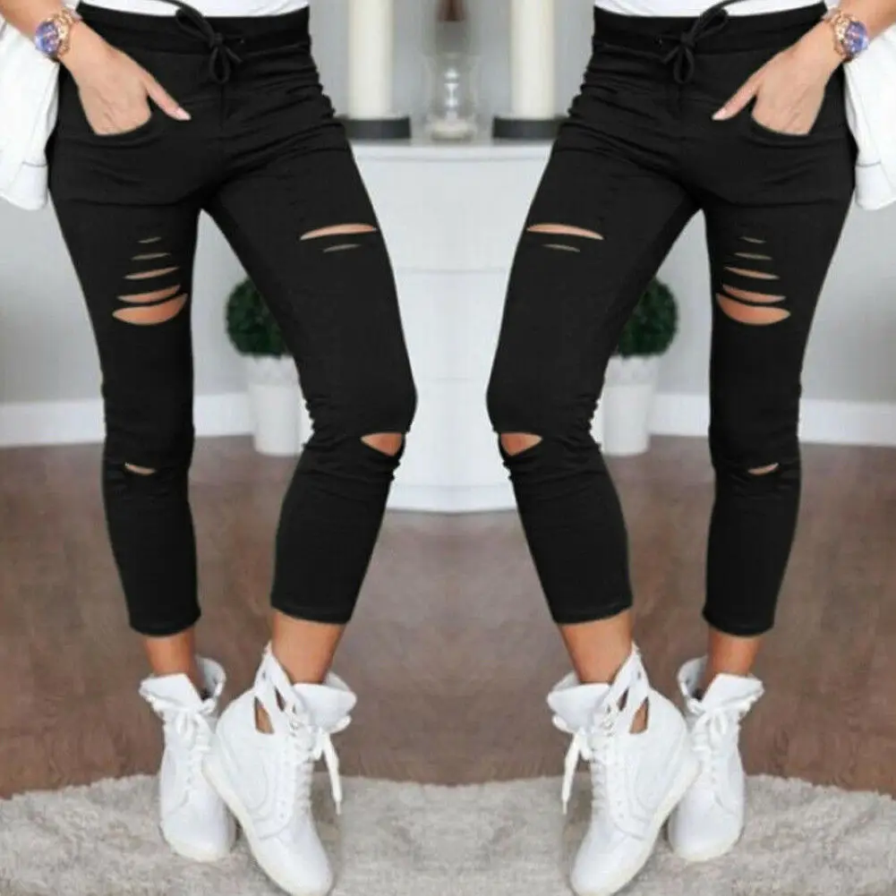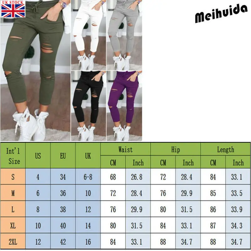 New Fashion Womens Ripped Stretchy Jeans Leggings Ladies Skinny Jegging Slim Hole Pants Black White Red Green Trousers