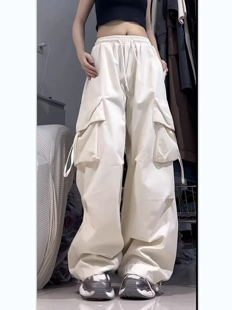 Casual Drawstring Trousers Vintage Cargo Pants for Women Big Pockets Streetwear Fashion Joggers Female High Waist Wide Leg Pants