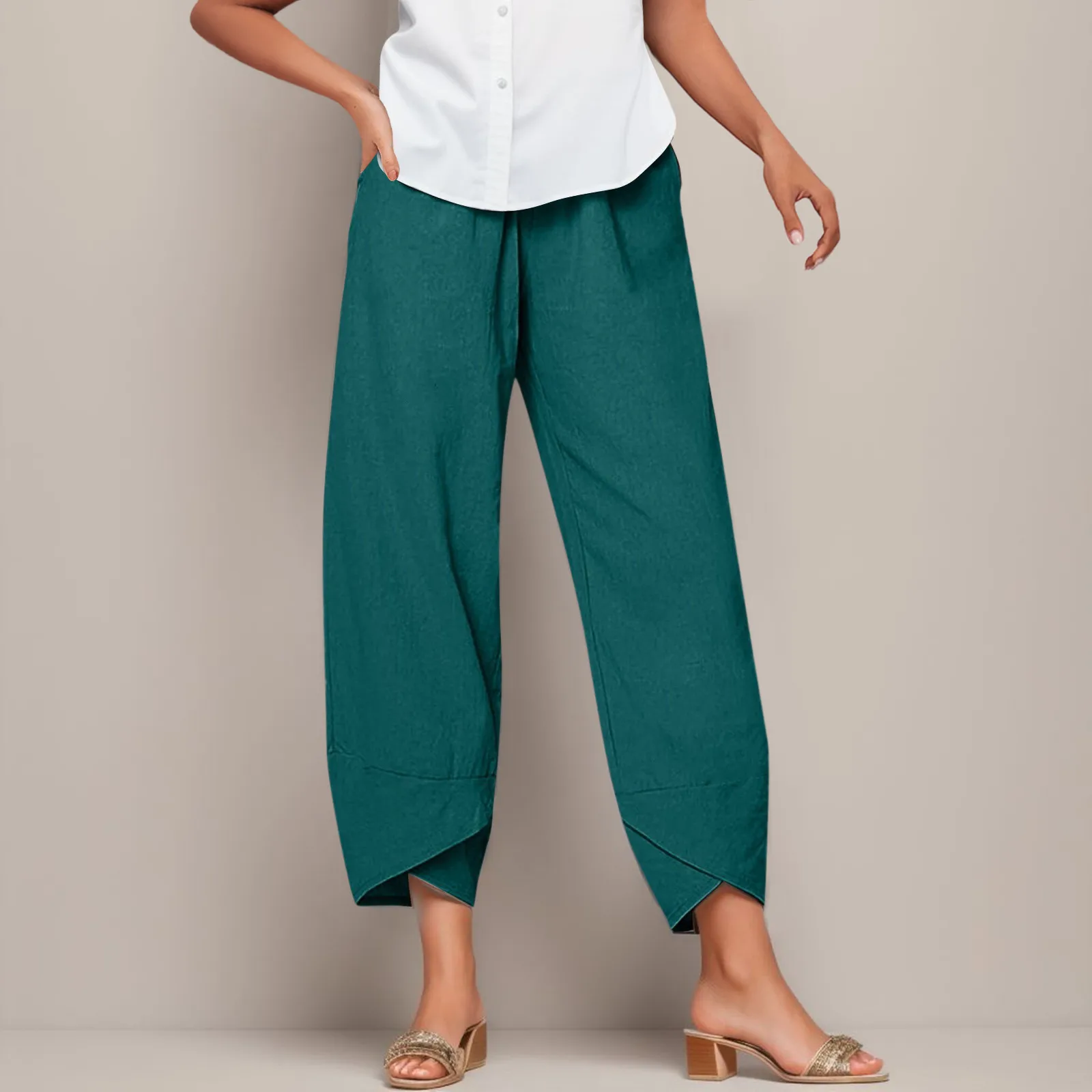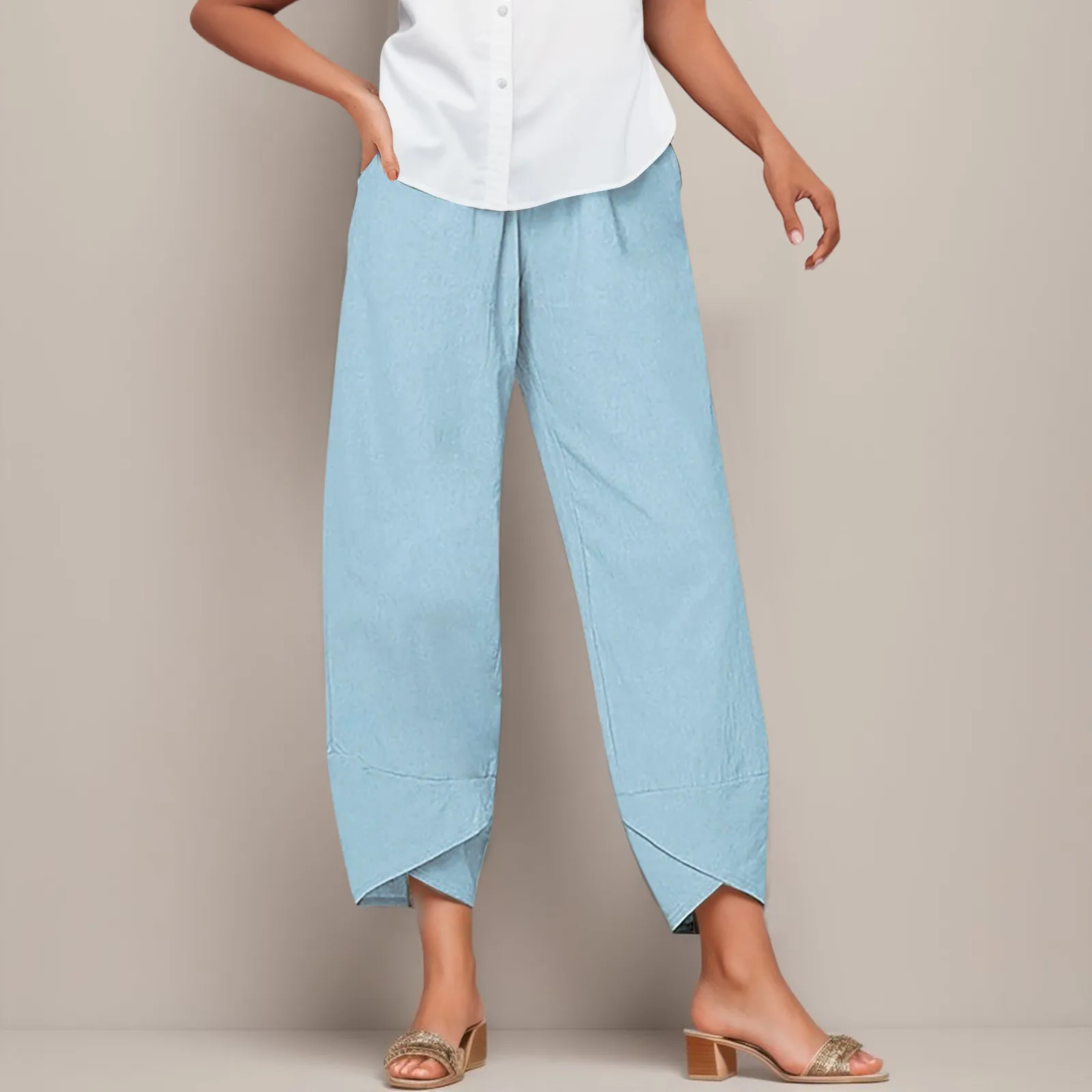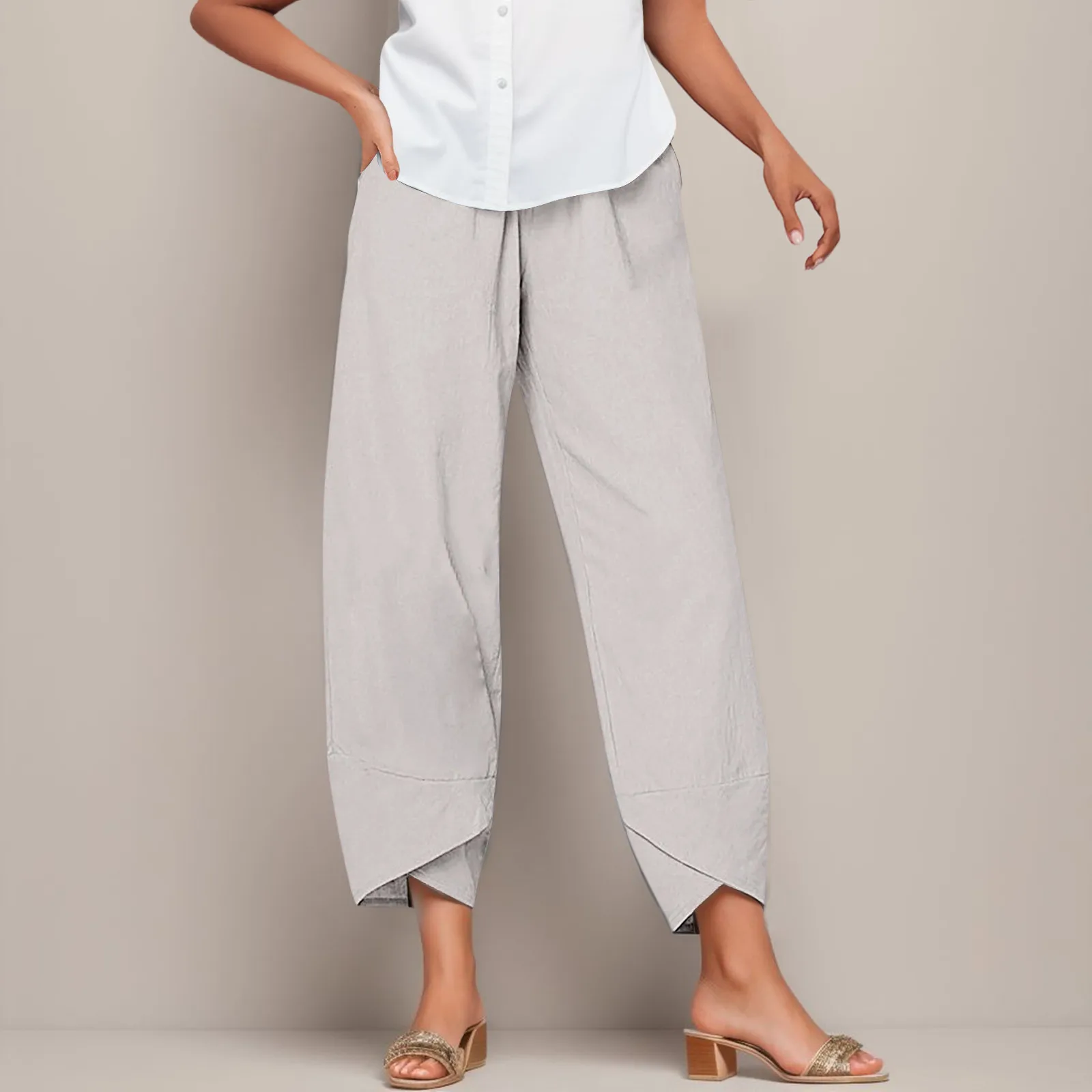 2024 Women's Summer Casual Cotton Linen Pants Vintage Loose Harem Pants Floral Printed Elastic Waist Wide Leg Pants Female