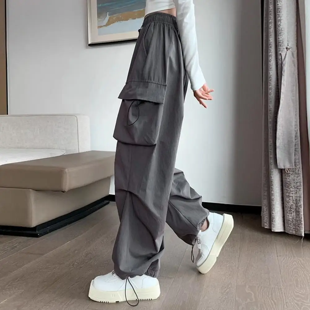 Women Cargo Pants Elastic Waist Mid-rise Quick-Drying Long Pants Solid Color Wide Leg Multi Pockets Sports Trousers