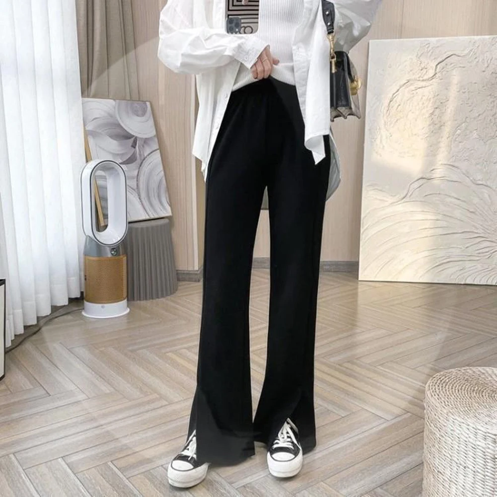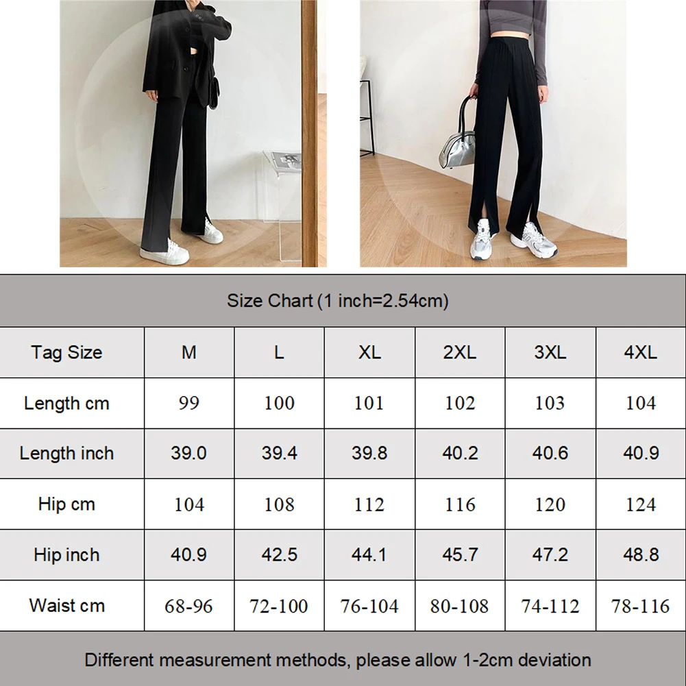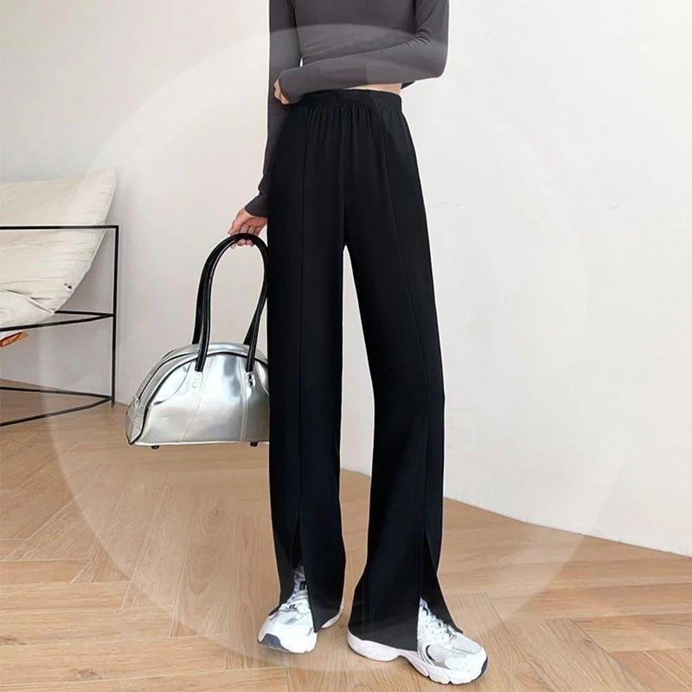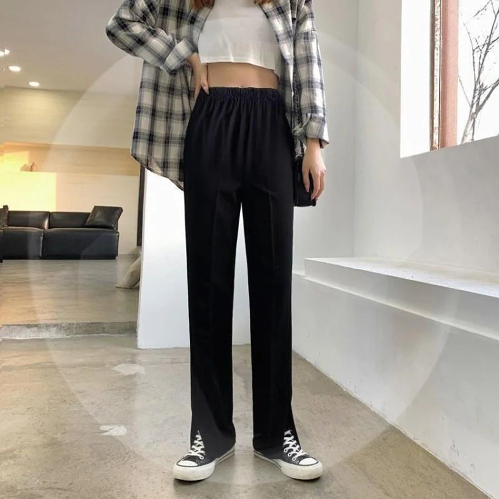 Women Chic-Slit Office Wear Straight Pants Vintage High Elastic Waist Long Trousers Baggy Korean Style Fashion Wide Leg Pants