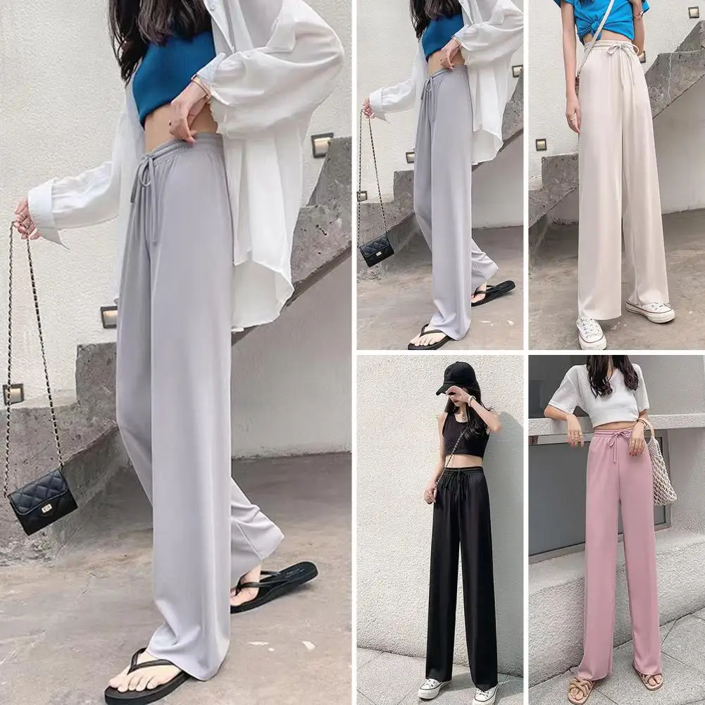 1Pc Women Summer Casual Pants Elastic Drawstring Waist Ice Silk Trousers Solid Color Straight Wide Leg Long Pants Streetwear