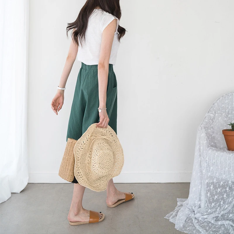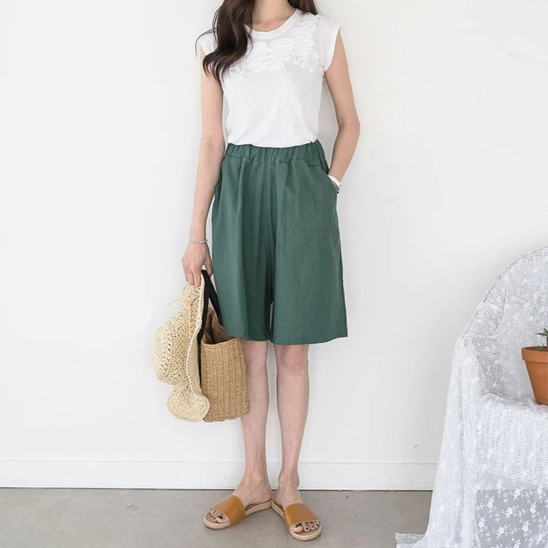 Summer Cotton Linen Casual Shorts for Women Korean Fashion Comfortable Solid Color Elastic Waist Fifth Pants Wide Leg Pants