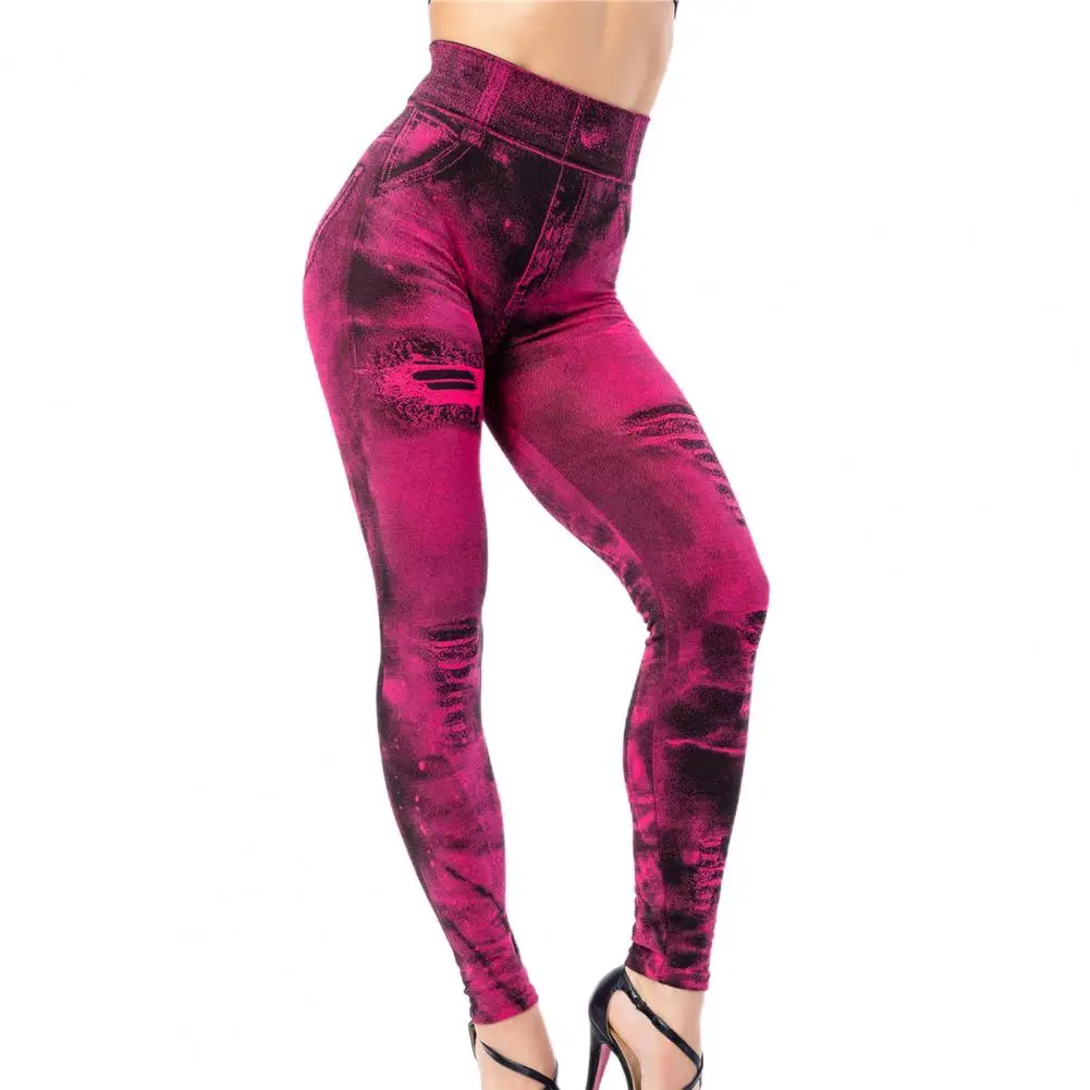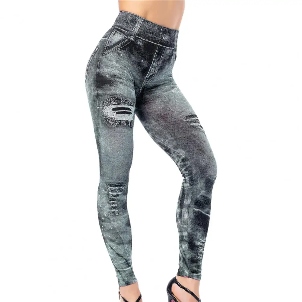 women Yoga Pants Multi Pockets Skinny Imitation Jeans Leggings Hip Lifting Ripped Holes Print Mid Waist Elastic Pants for Sports