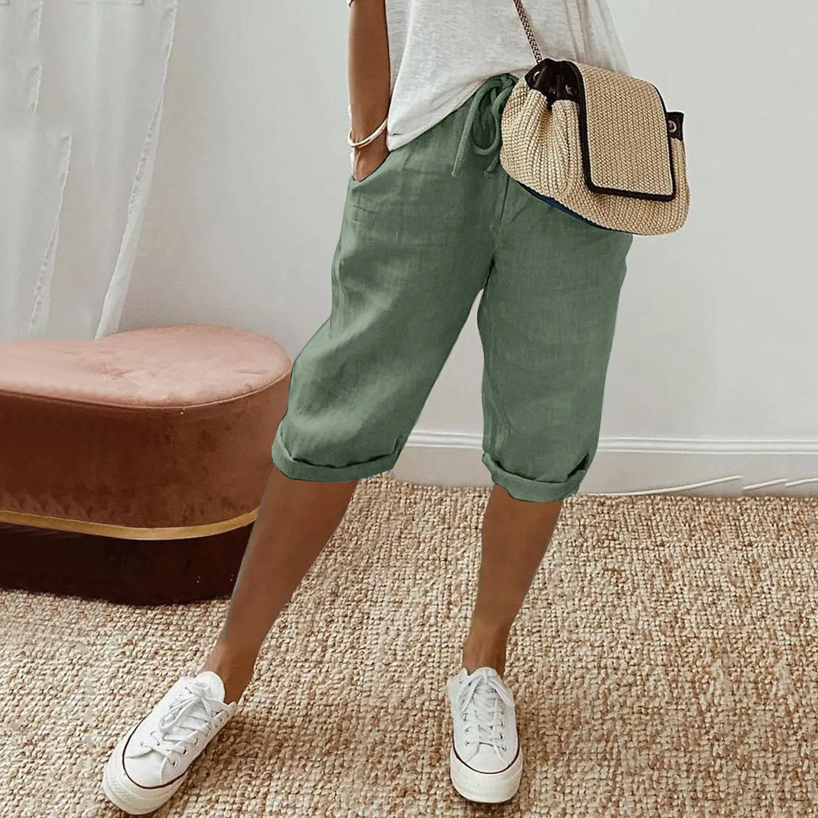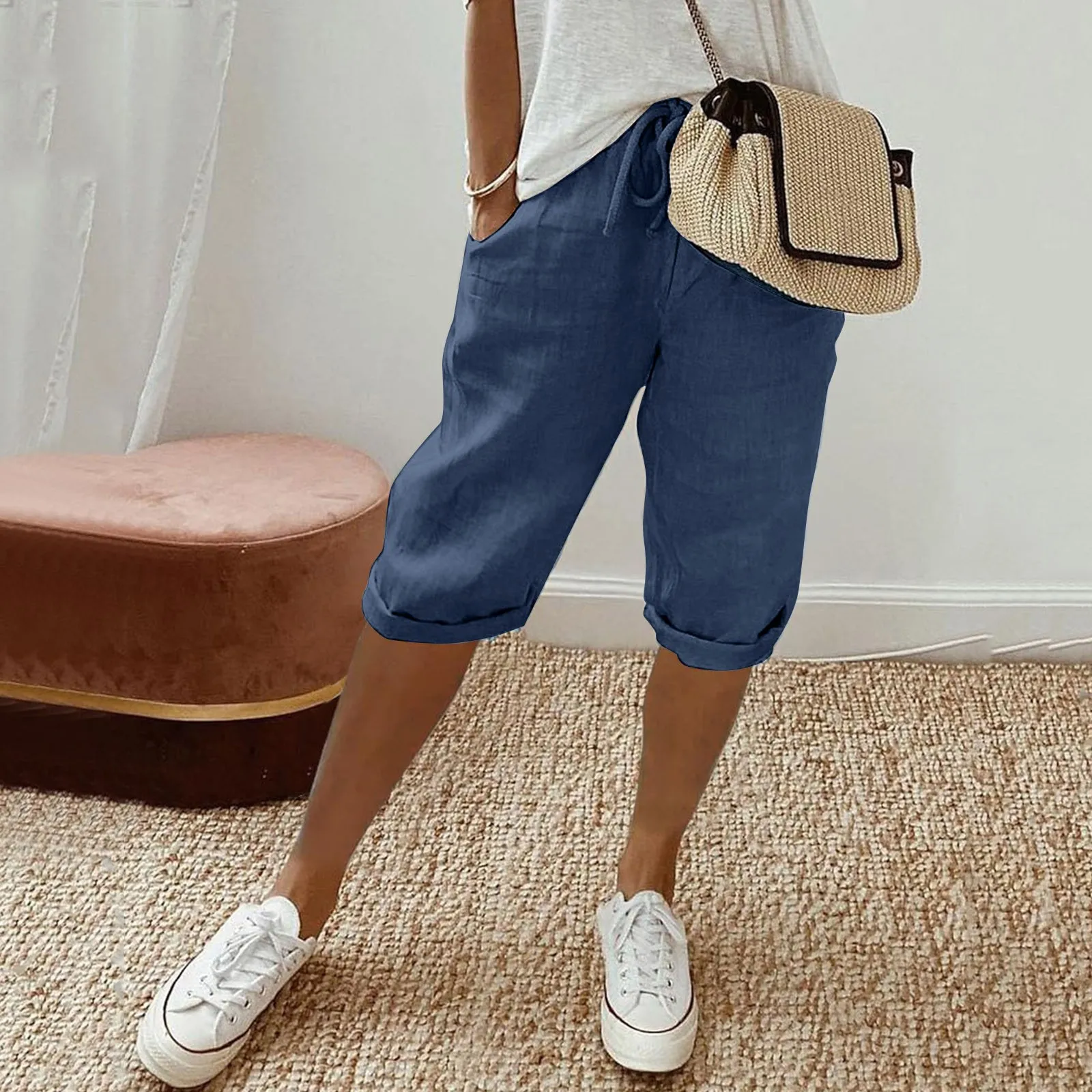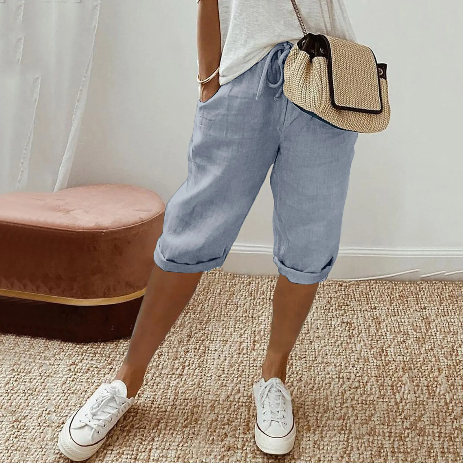 Name | Women's Fashion Solid Color Casual Capris Pants With Pockets Drawstring Elastic Waist Cotton And Linen Comfortable Large Pants |