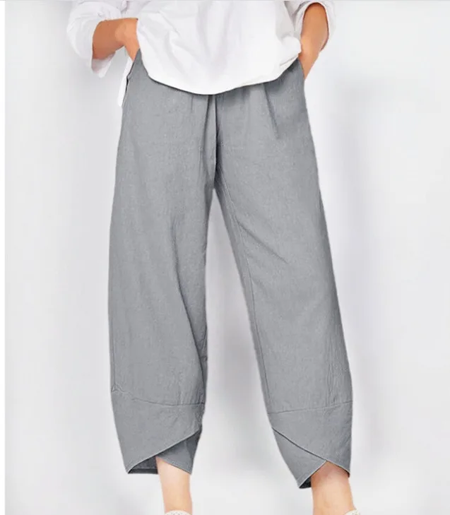 Women Summer Elastic Waist Cotton Linen Loose Casual Pants Home Wear Wide Leg Pants Ankle Length