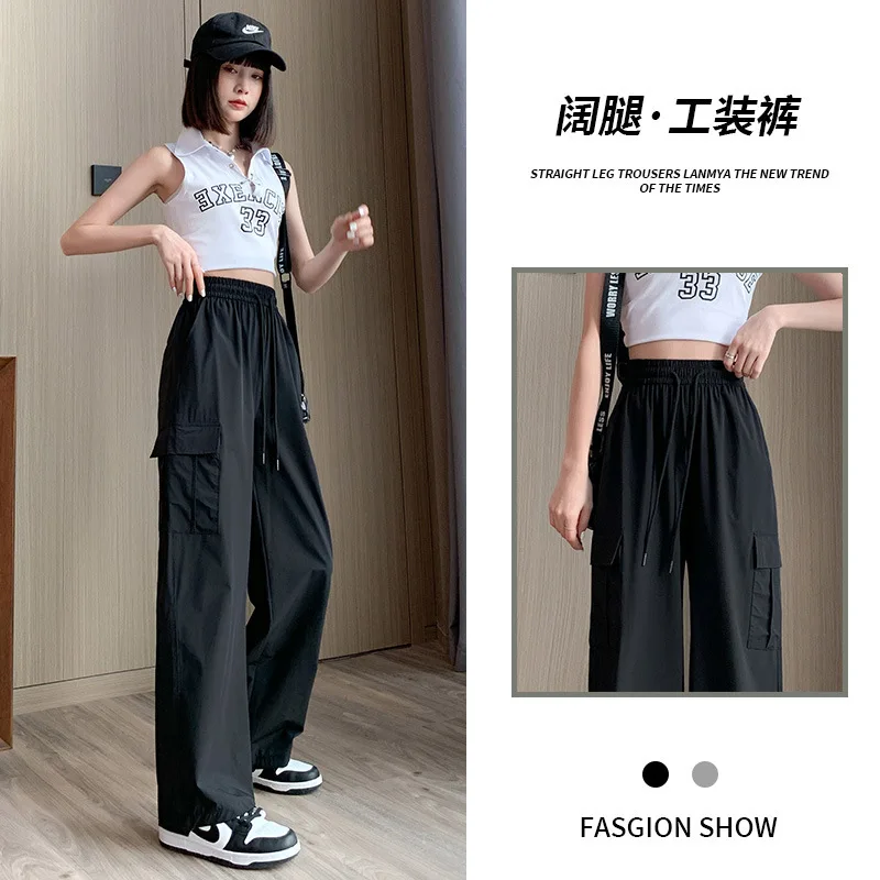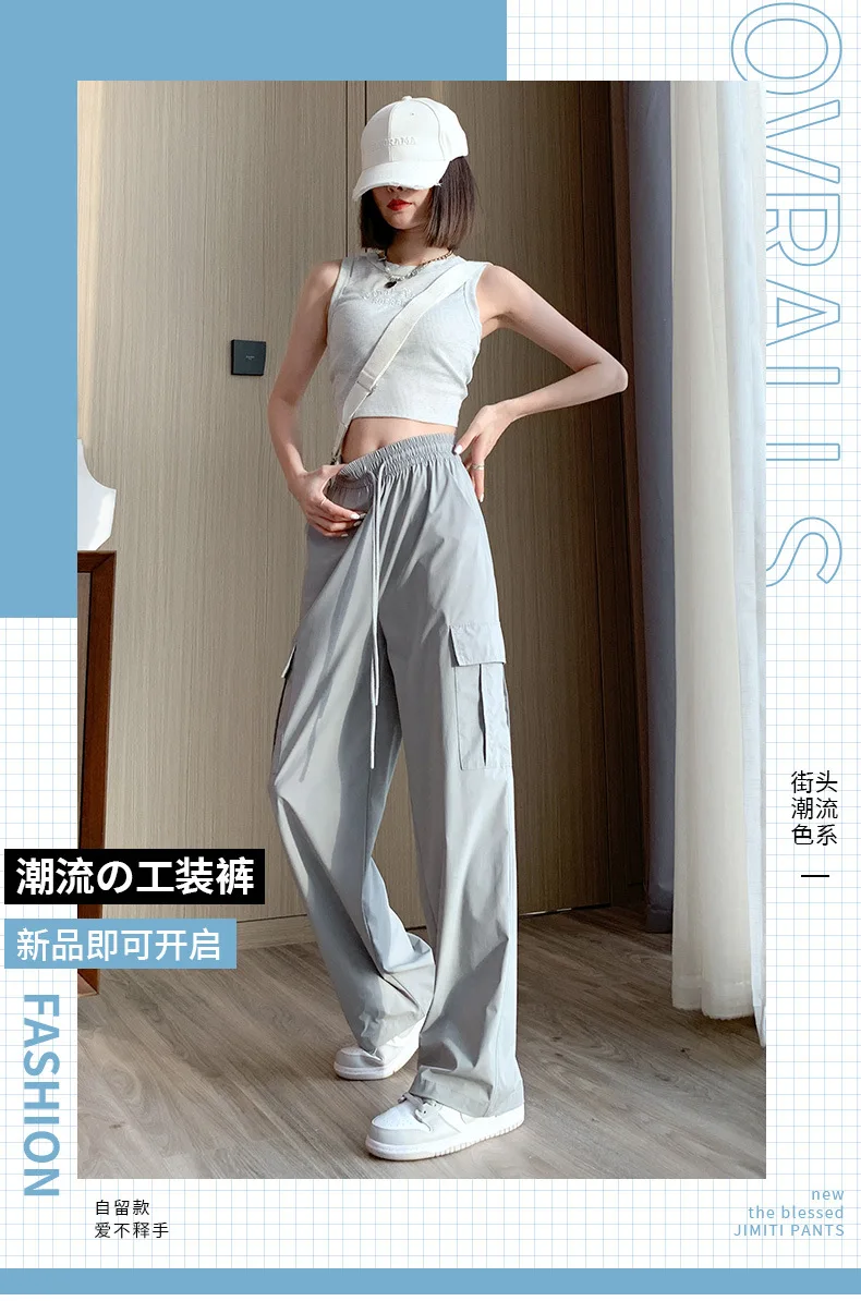 Name | Women Cargo Pants High Waist Solid Trousers Female Big Pockets Casual Elastic Waist Pull Rope Polyester Fibre Streetwear Women |