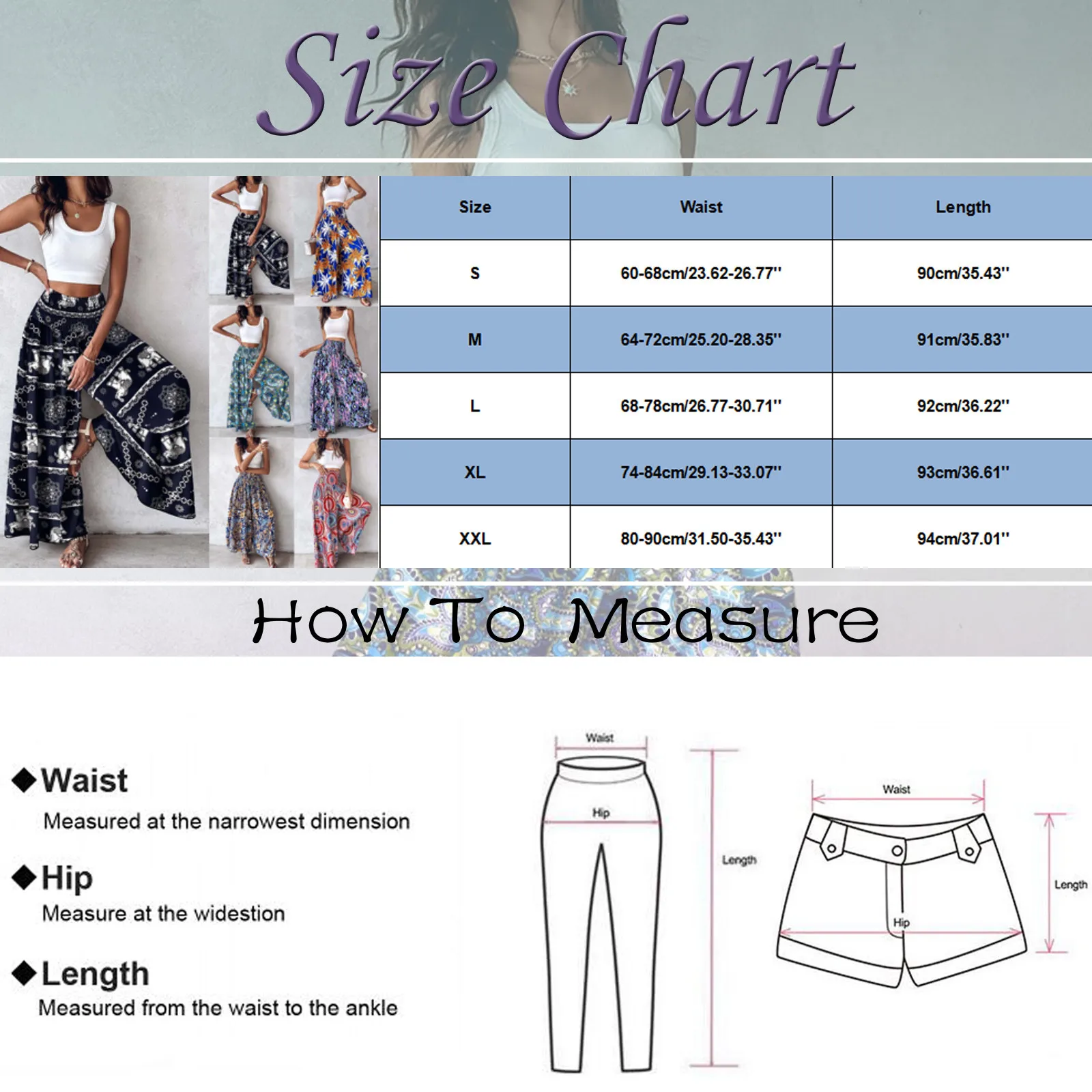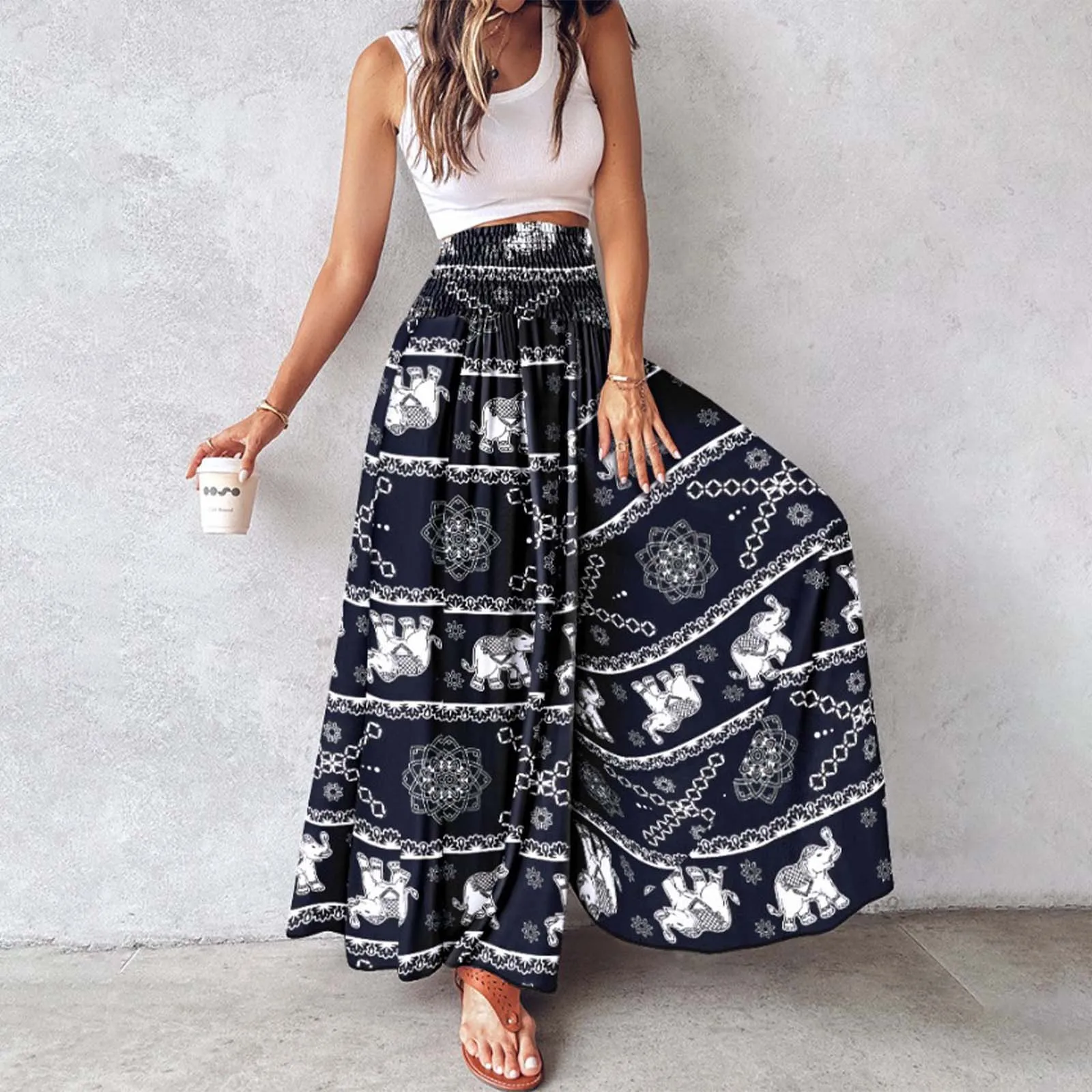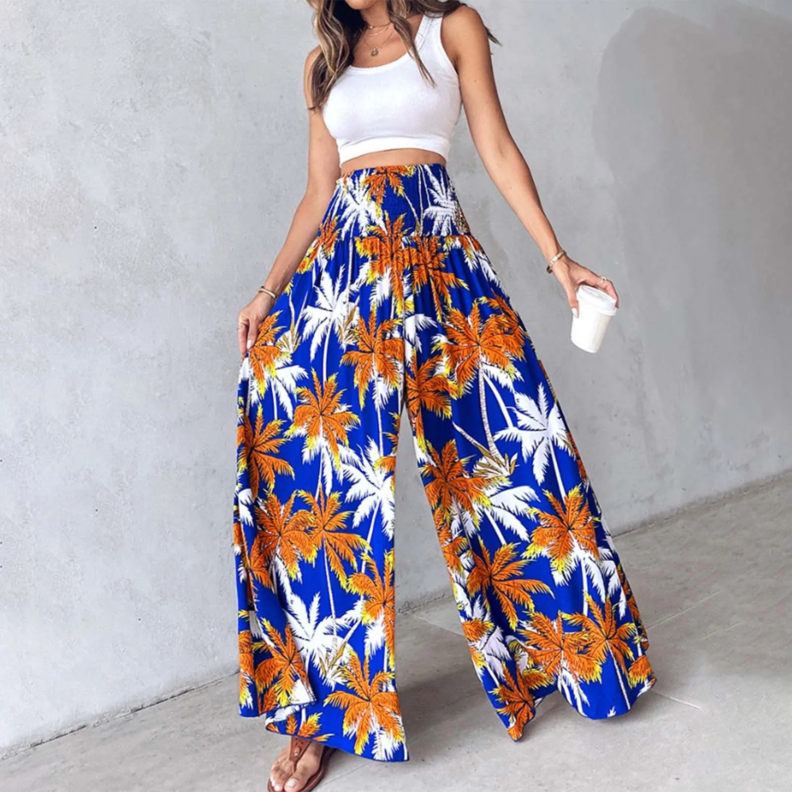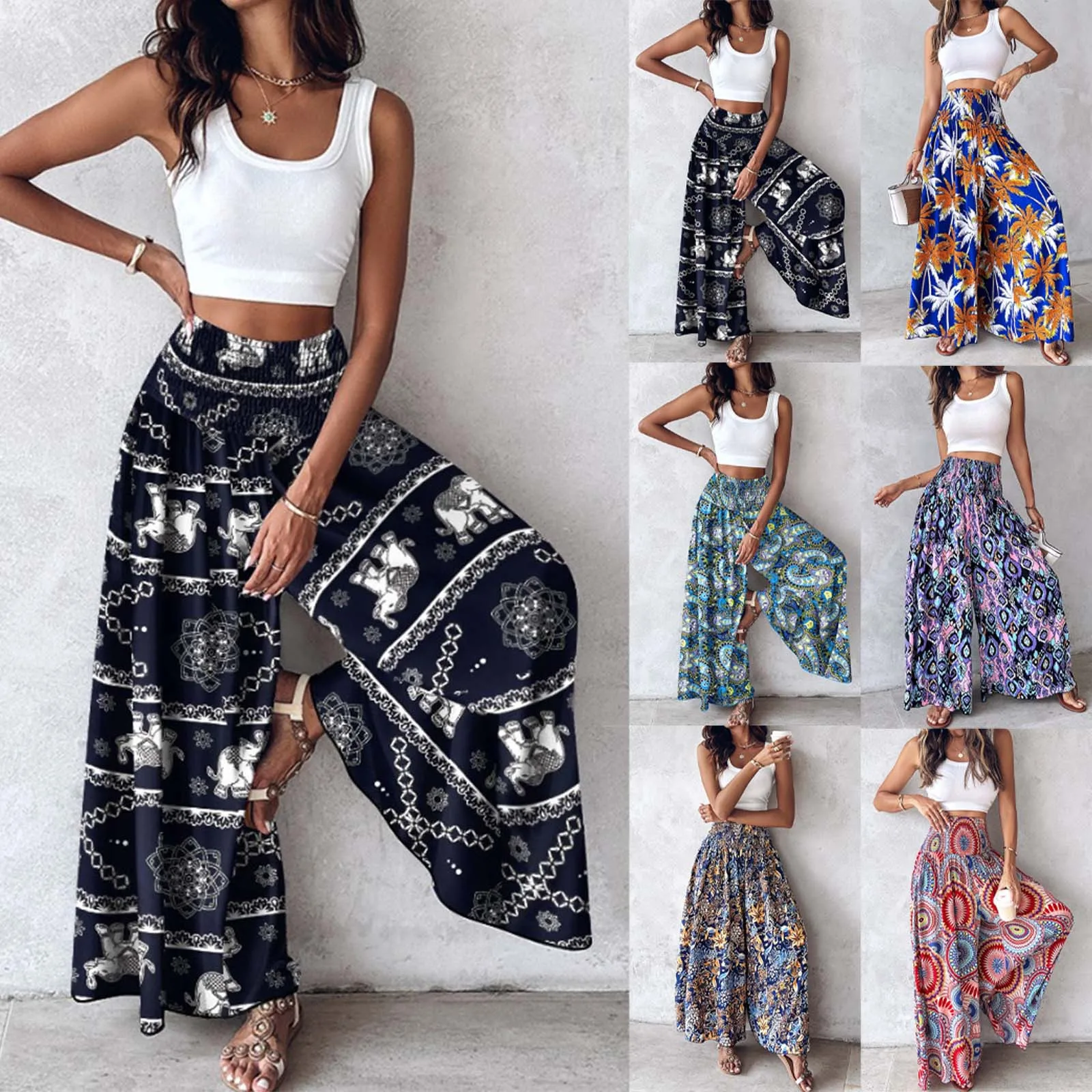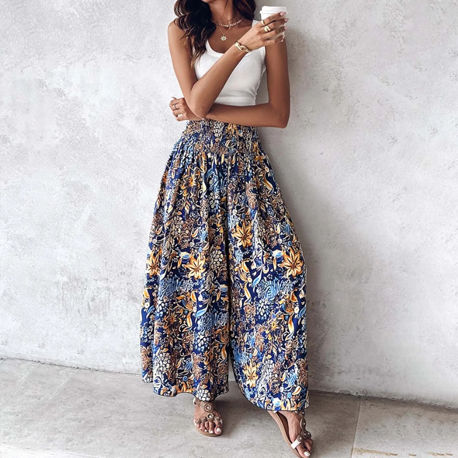 Boho Floral Print Wide Leg Pants Women Cotton Vintage Elastic High Waist Pants Fashion Casual Loose Vacation Beach Trousers