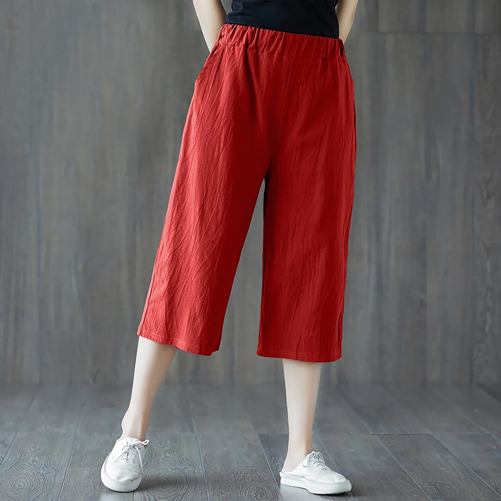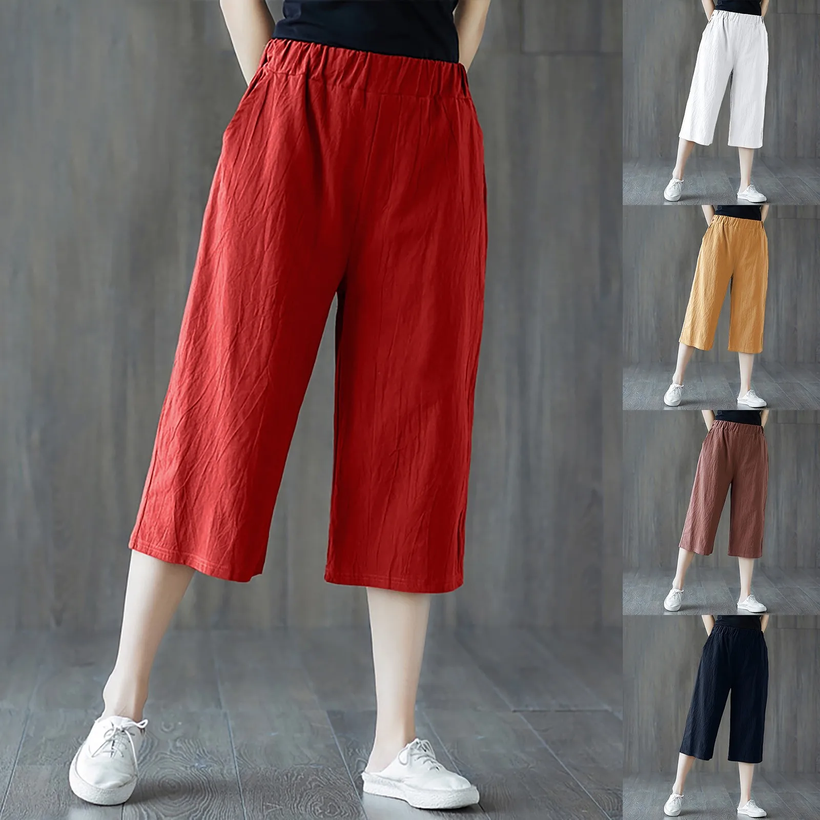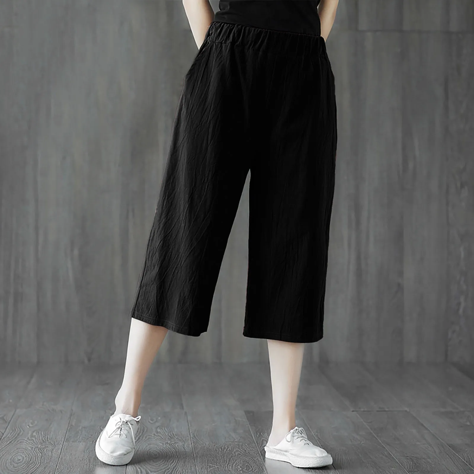 Spring Summer Cropped Pants Women Elastic Waist Wide Leg Trousers High Waist Pants Casual Wide Leg Pantalones