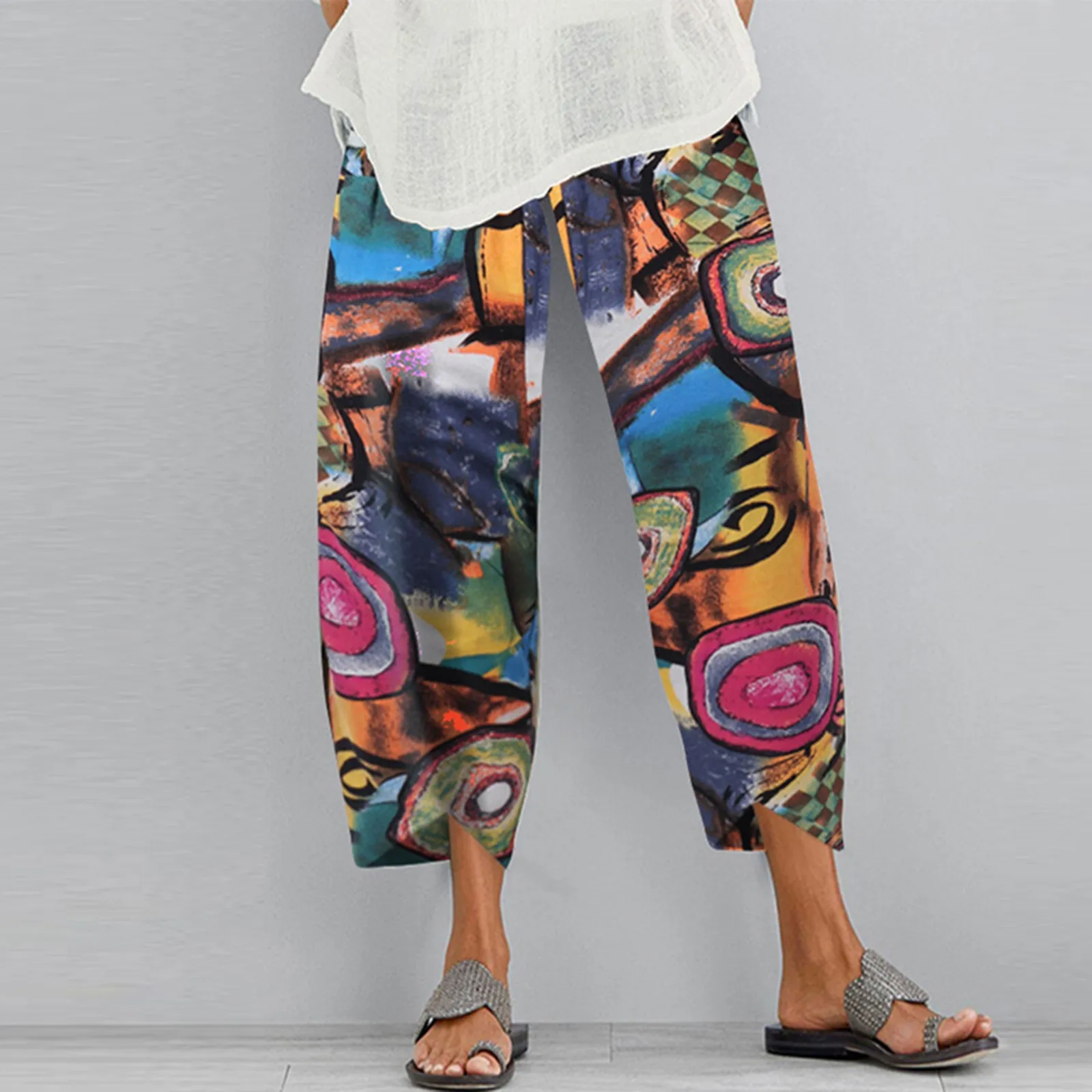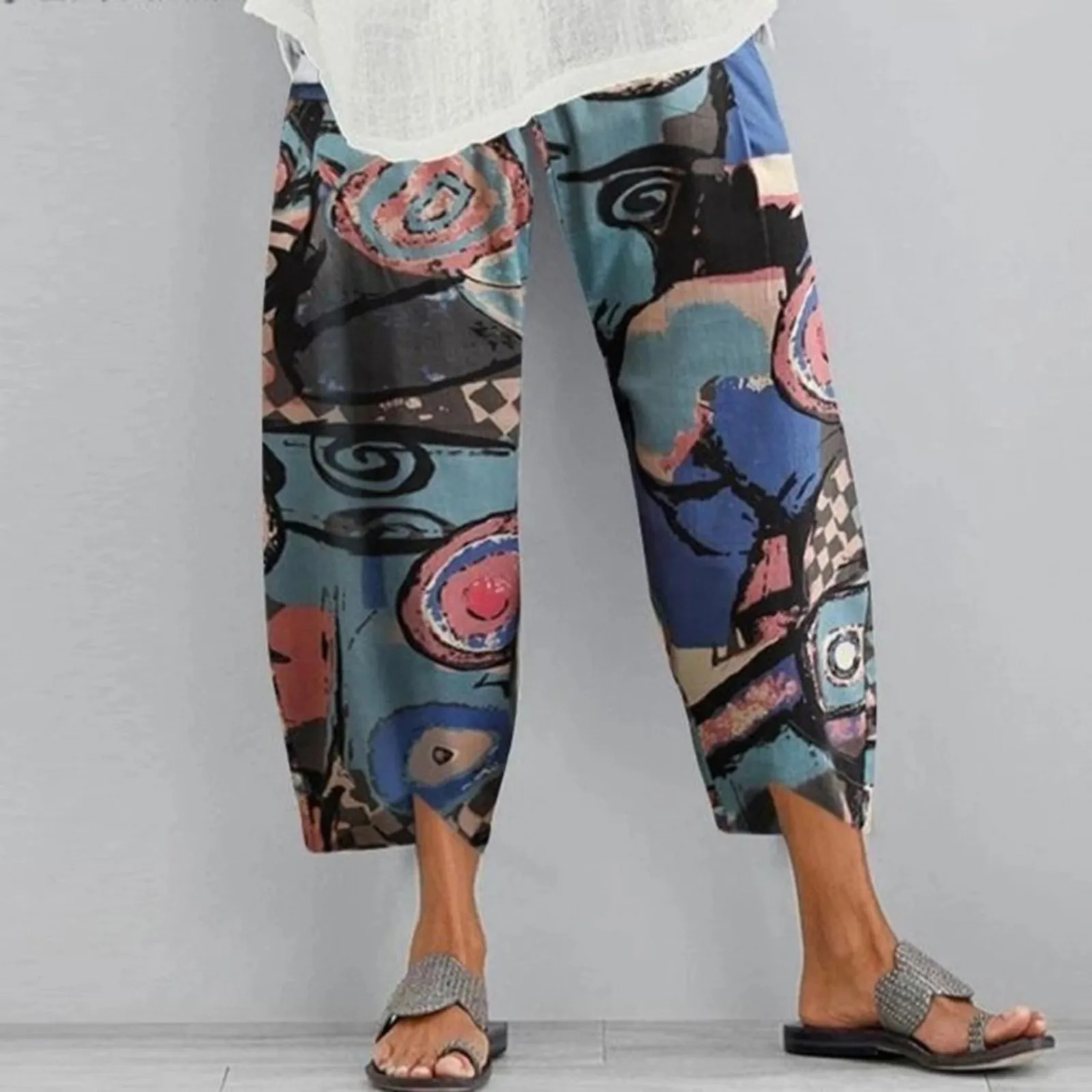 Vintage Cotton and Linen Loose Harem Pants Casual High Waist Wide Leg Trousers Women Harajuku Printed Baggy Pants Oversized