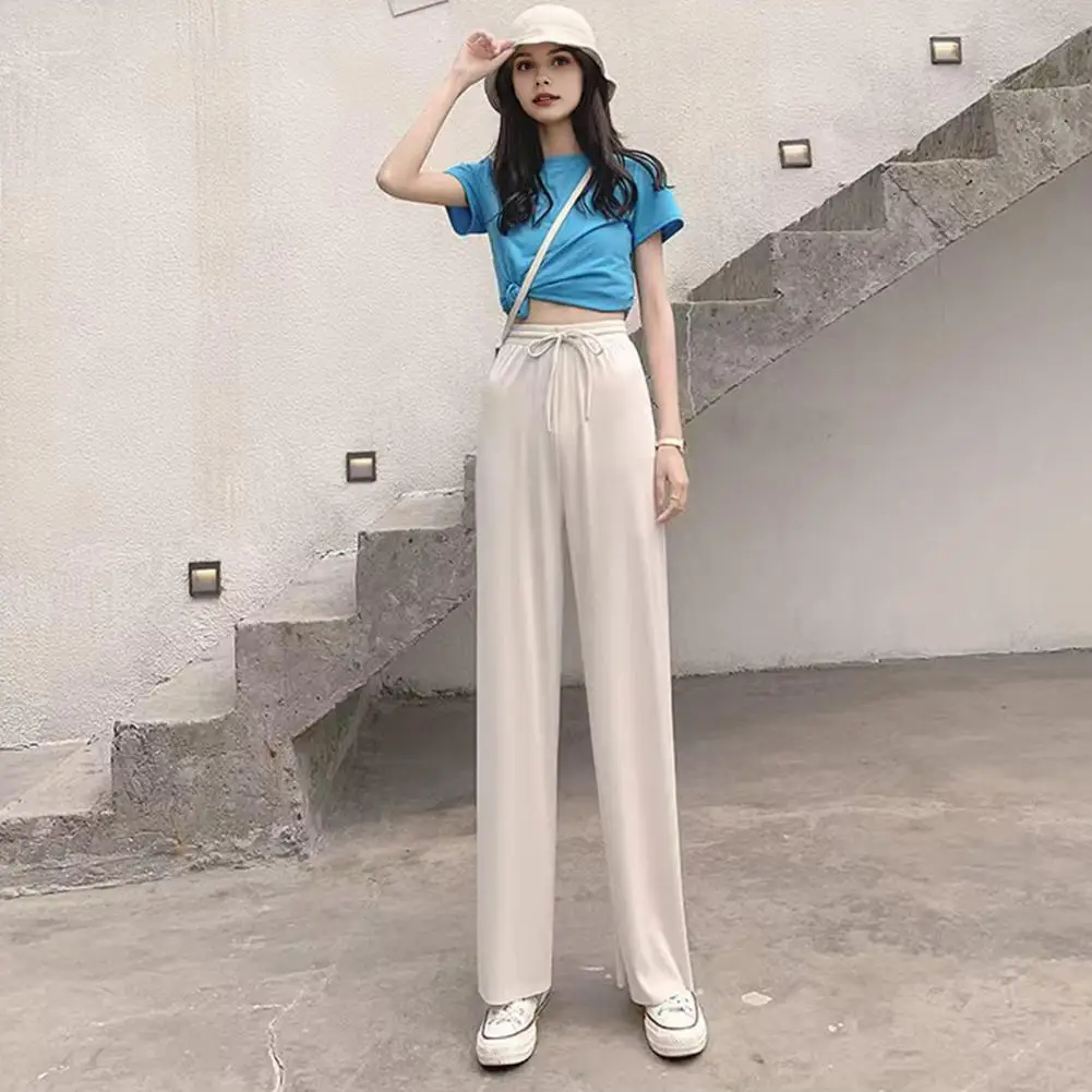Lightweight Wide-leg Pants Elastic Drawstring Waist Women's Summer Pants Solid Color Straight Wide Leg Trousers for Streetwear
