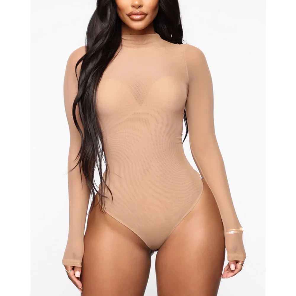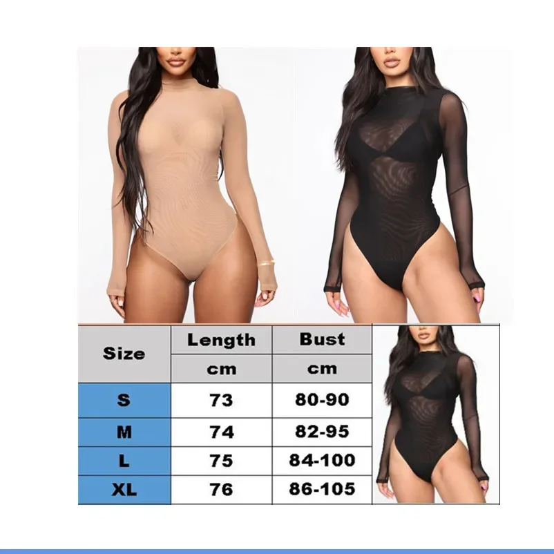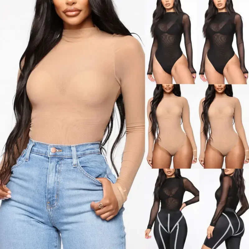 Bodysuits High Neck Bodycon Jumpsuit See Through Romper Black Beige NEW Sexy Mesh See Through Bodysuit Women Long Sleeve Sheer