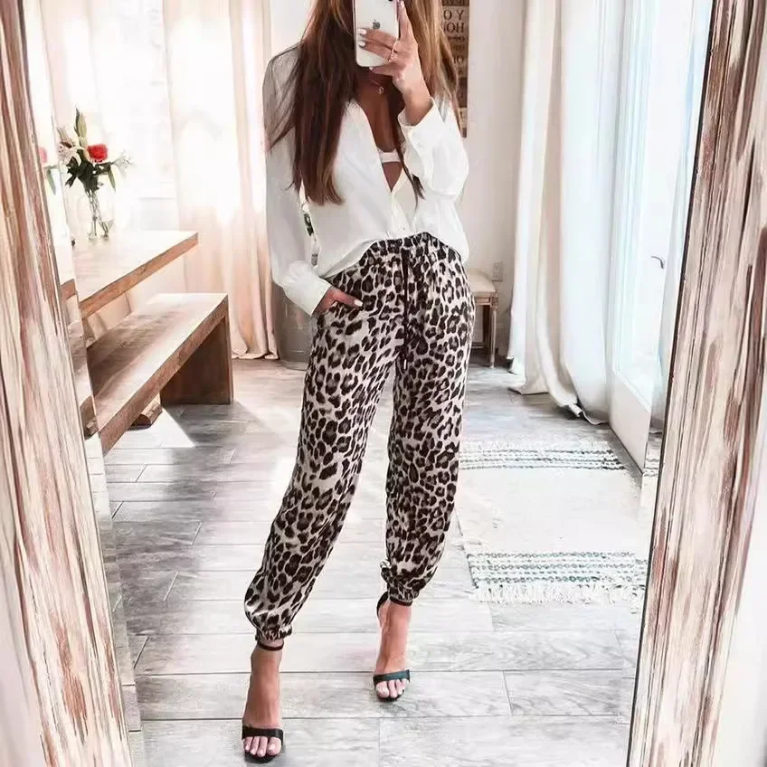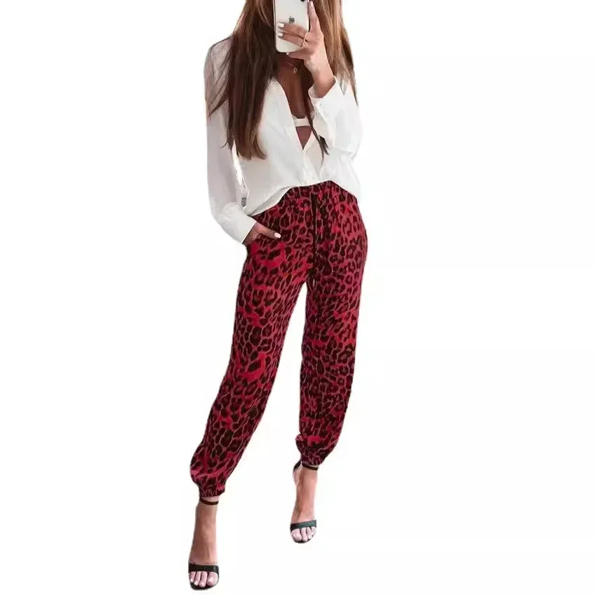 Women's Autumn and Winter New Fashion Leopard Print Elastic Waist Leisure Bind Foot Pants Hip Hop Thigh-high Pants Y2k Trousers
