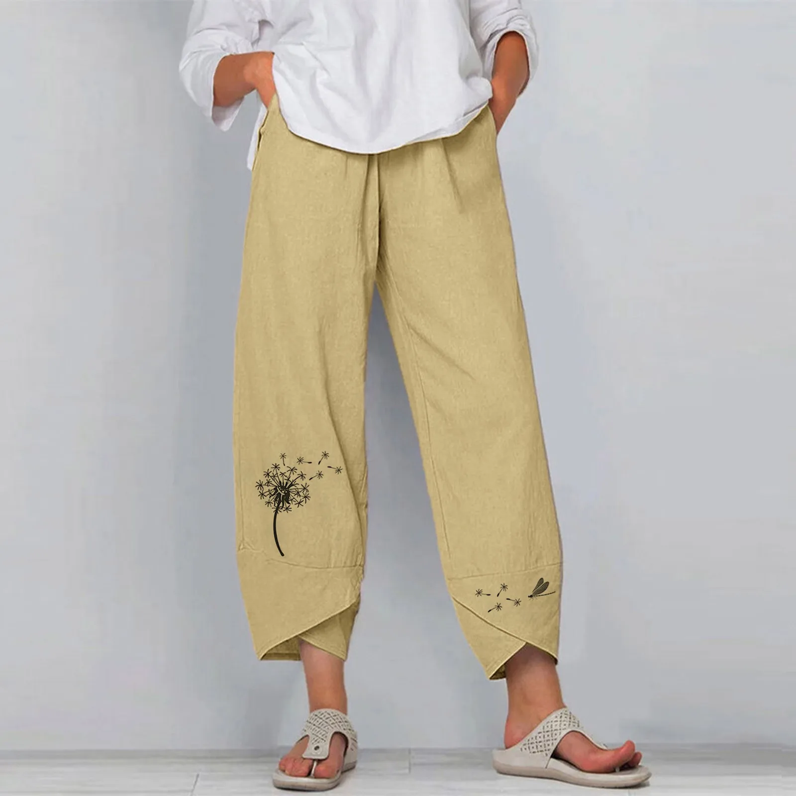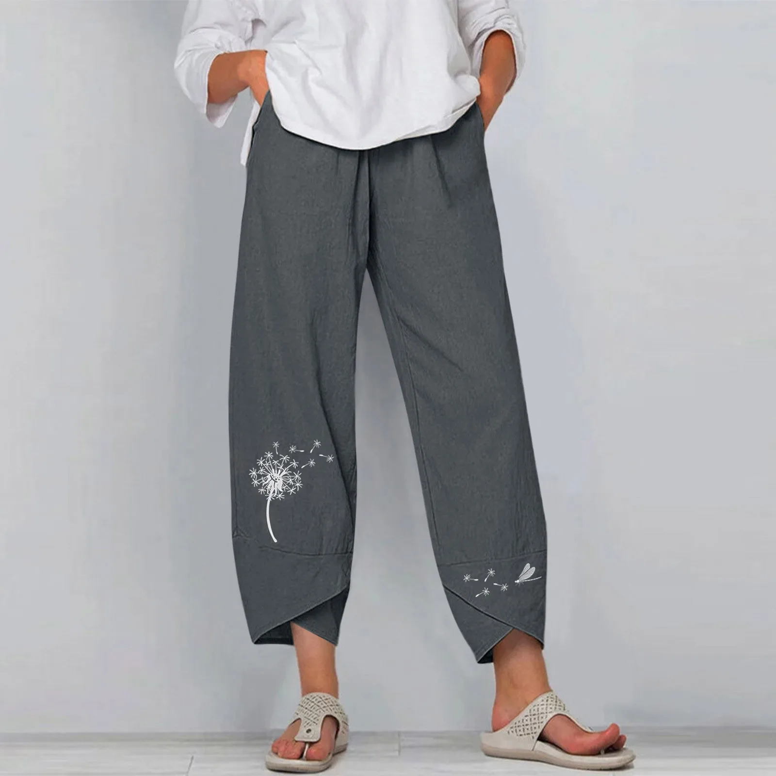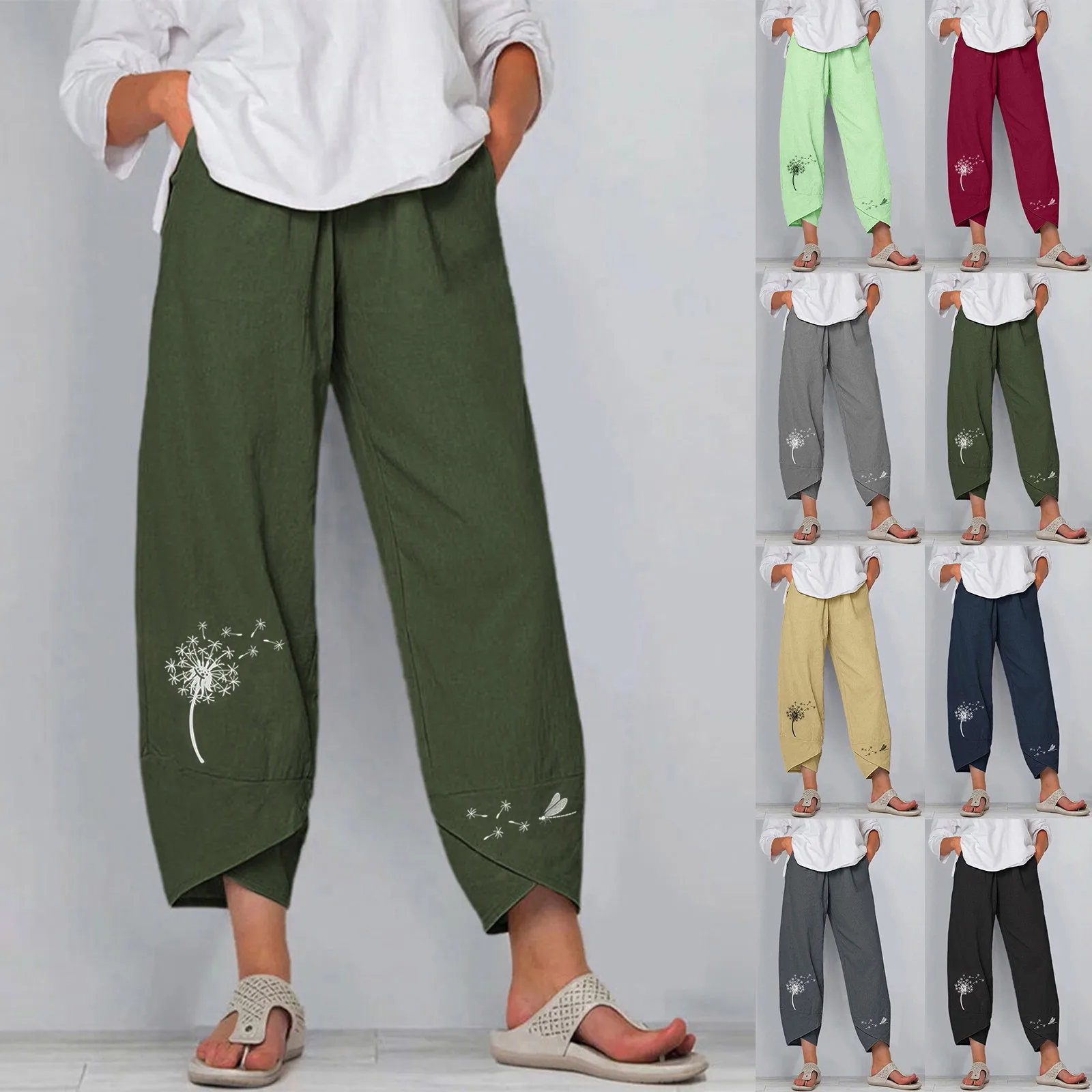 Autumn Women's Summer Casual Cotton Linen Pants Vintage Loose Harem Pants Floral Printed Elastic Waist Wide Leg Pants Female