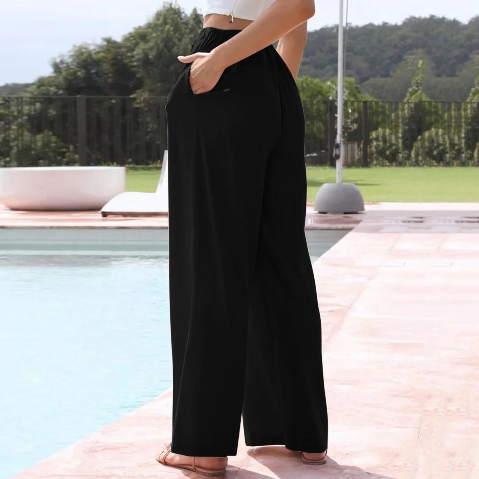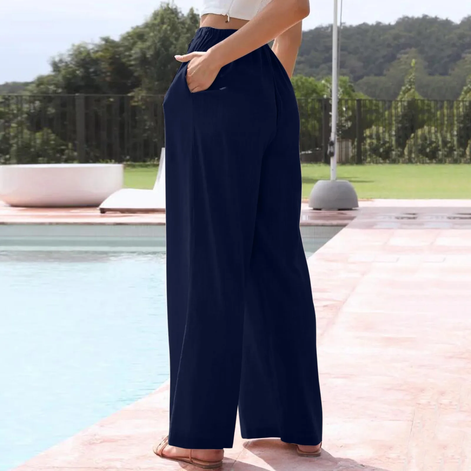 Women Wide Leg Pants Casual Elastic High Waist Drawstring Baggy Pants Streetwear Solid Cotton And Linen Long Trousers Beach