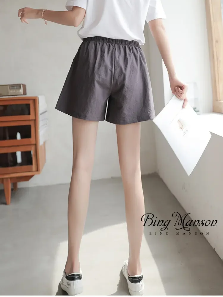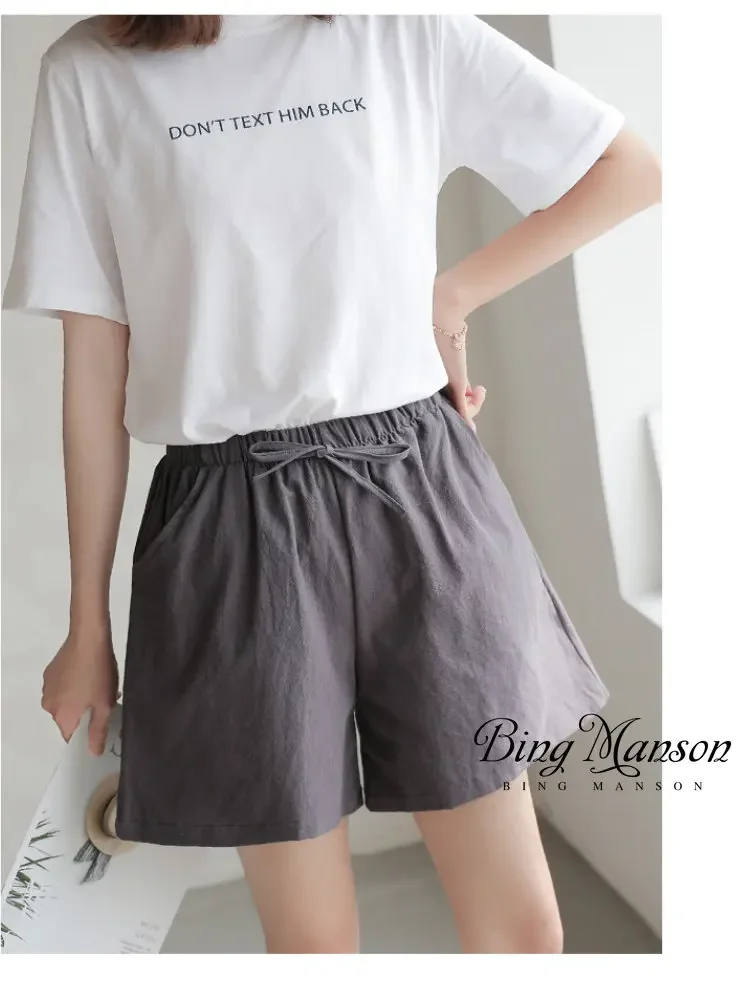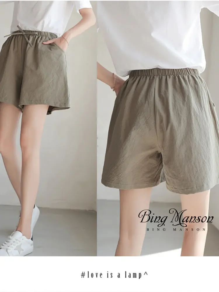 New Womens Shorts Spring Summer Loose Linen Cotton Casual Khaki Korean Wide Leg Pant Drawstring Elastic Waist Bikers Shorts