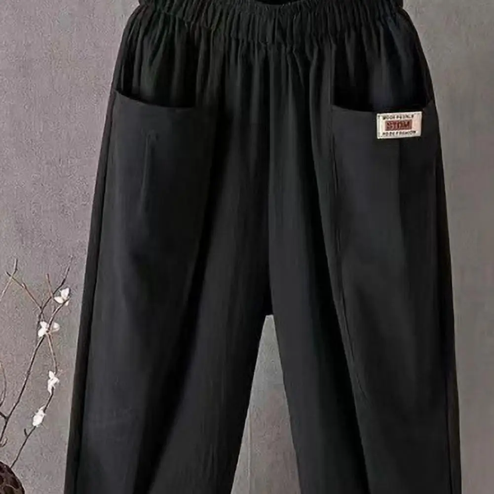 Summer Women Cropped Pants Mid-rise Elastic Waistband Wide Leg Pants Pockets Design Harem Trousers