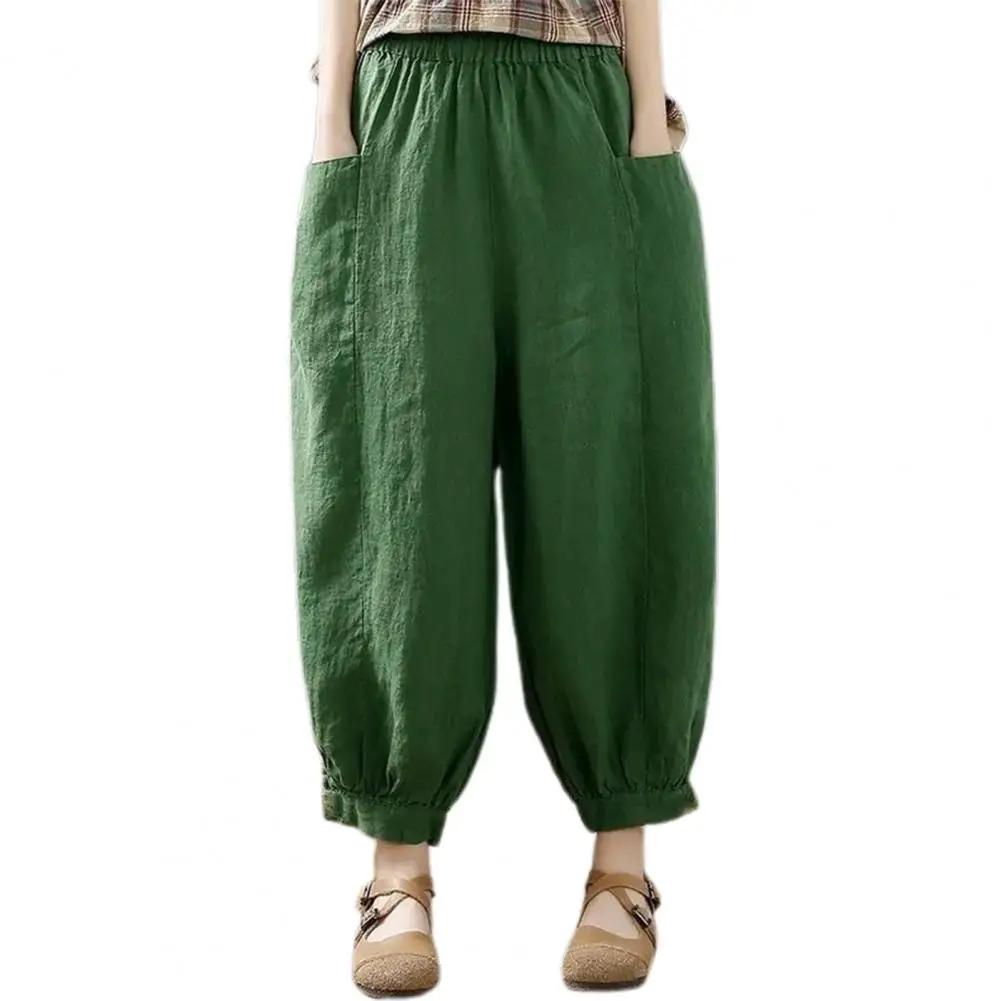 Name | Women Lantern Pants Elastic Waist Pockets Loose Deep Crotch Cotton Linen Casual Plus Size Ninth Female Retro Baggy Green Bloomer |