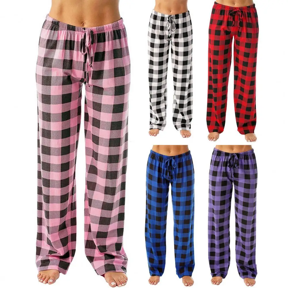 Long Pants Plaid Print Wide Leg Women's Pants with High Elastic Waist Breathable Pockets Casual Comfortable Long for Ladies