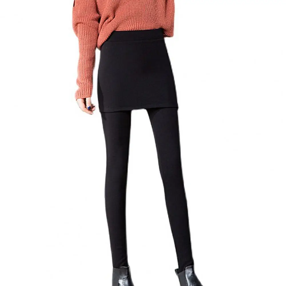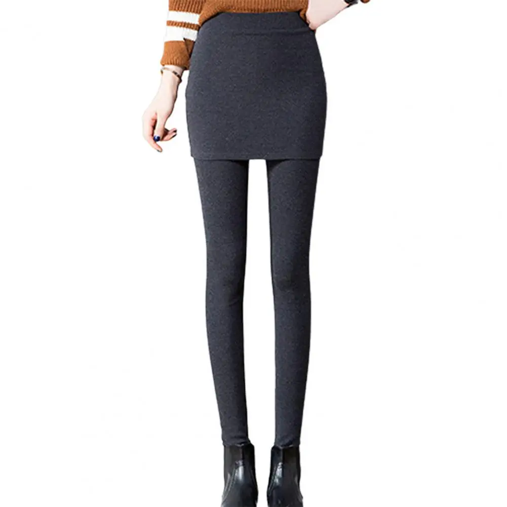 Women Pants Solid Color Stretchy Fake Two Piece Pants Korean Style Slim-fitting Leggings With Skirt For Autumn Winter