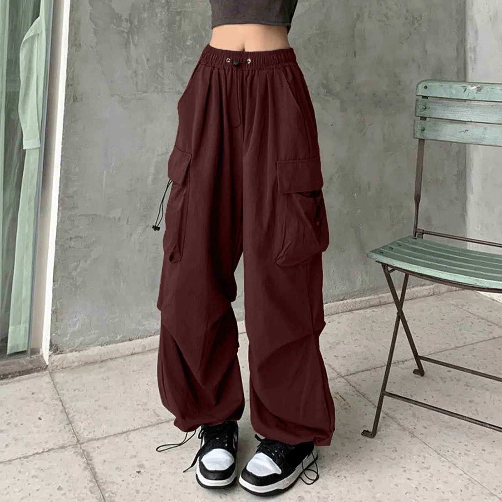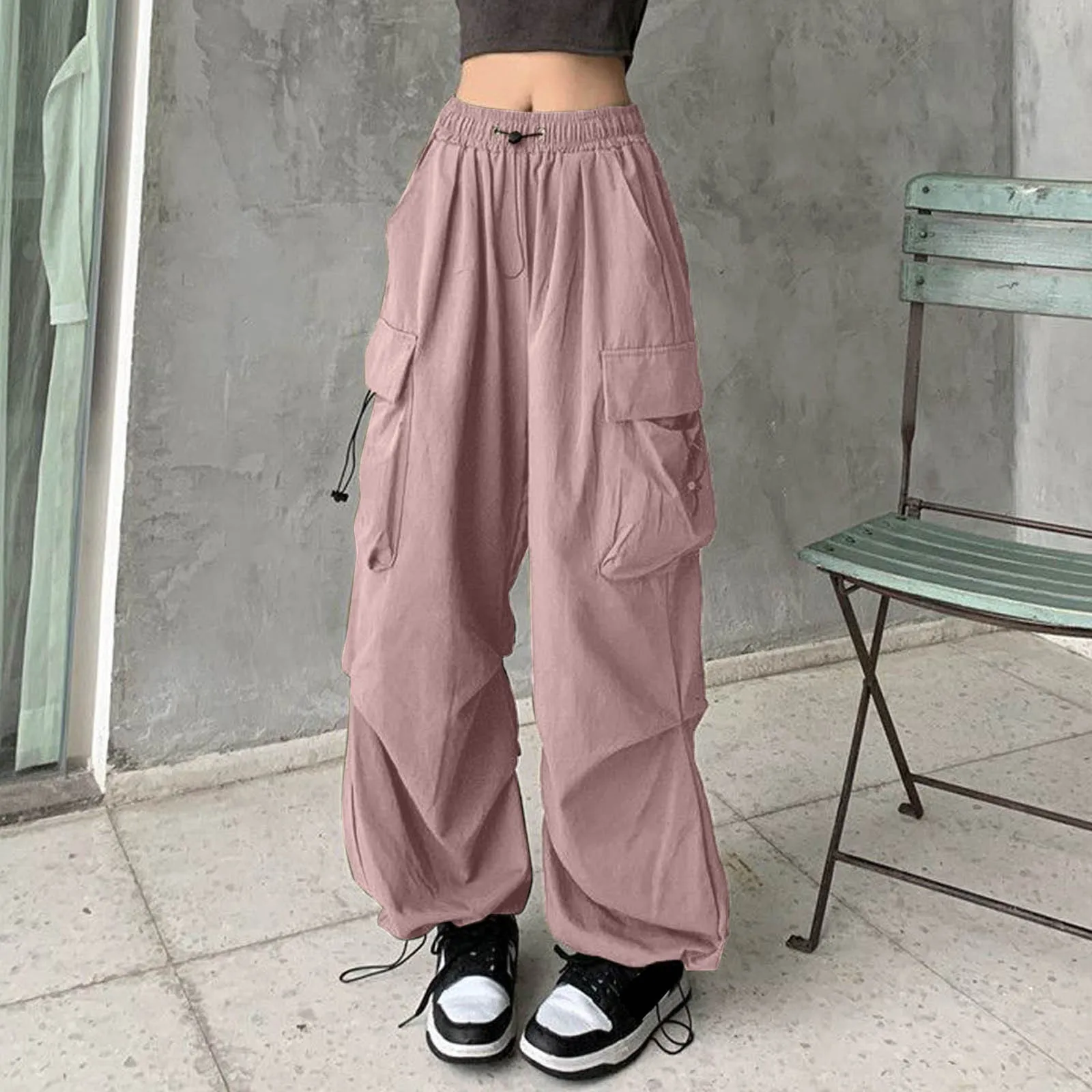 Name | Women Big Pockets Cargo Pants Y2k High Elastic Waist Drawstring Baggy Trousers Vintage Casual Loose Side Zipper Straight Wear |