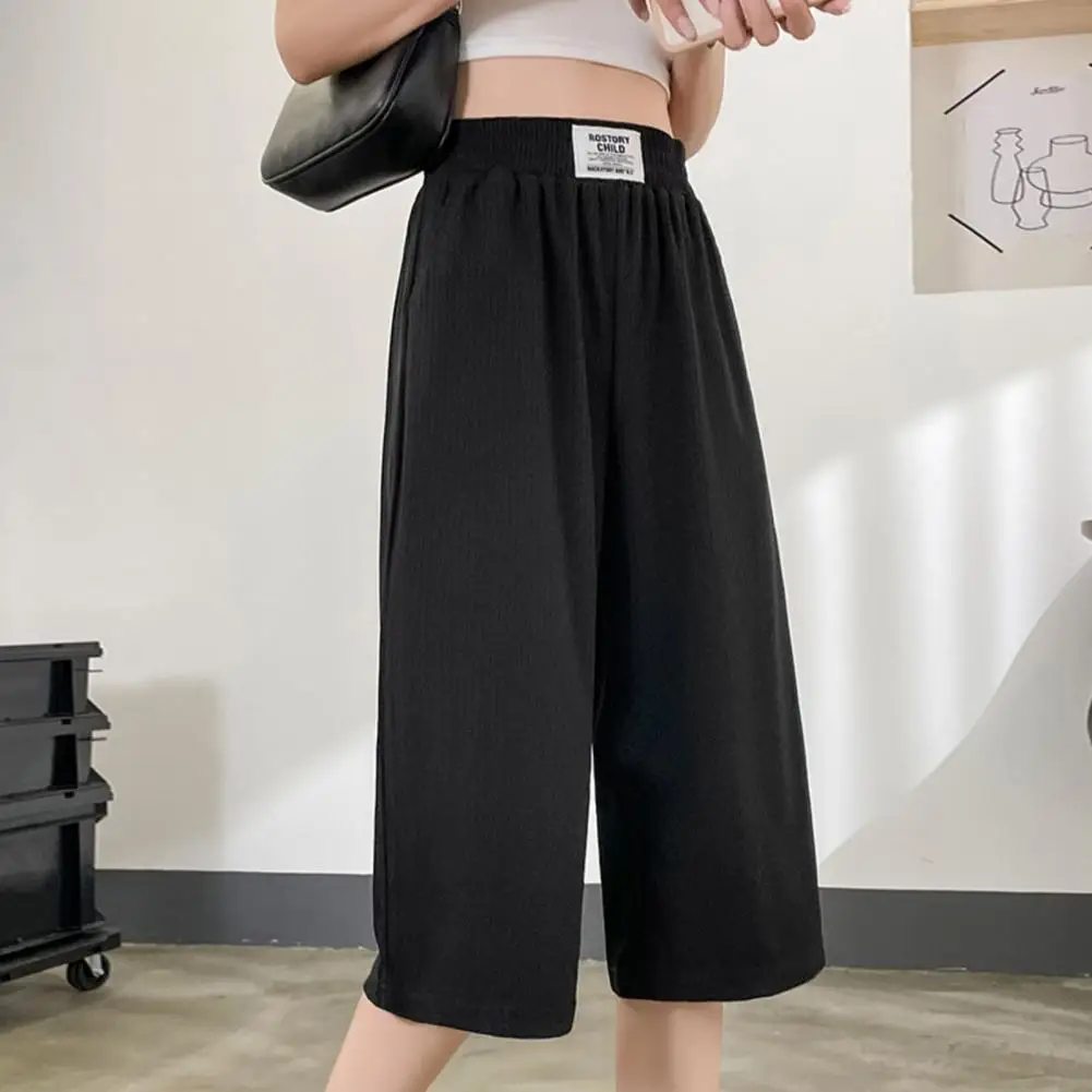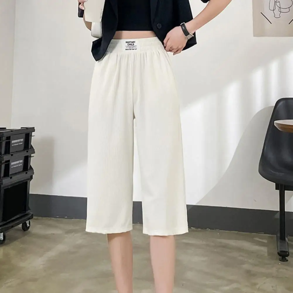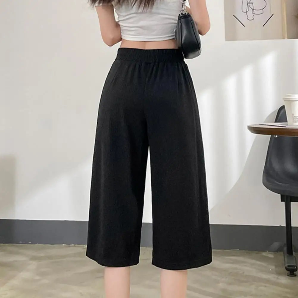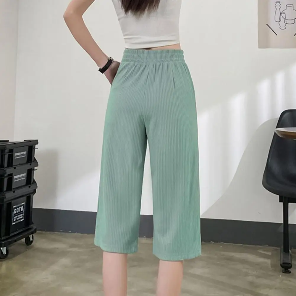 Women Cropped Pants Wide-leg Pants Streetwear Summer Ice Silk Cropped Pants with Elastic Waist Pockets Loose Fit Wide Leg