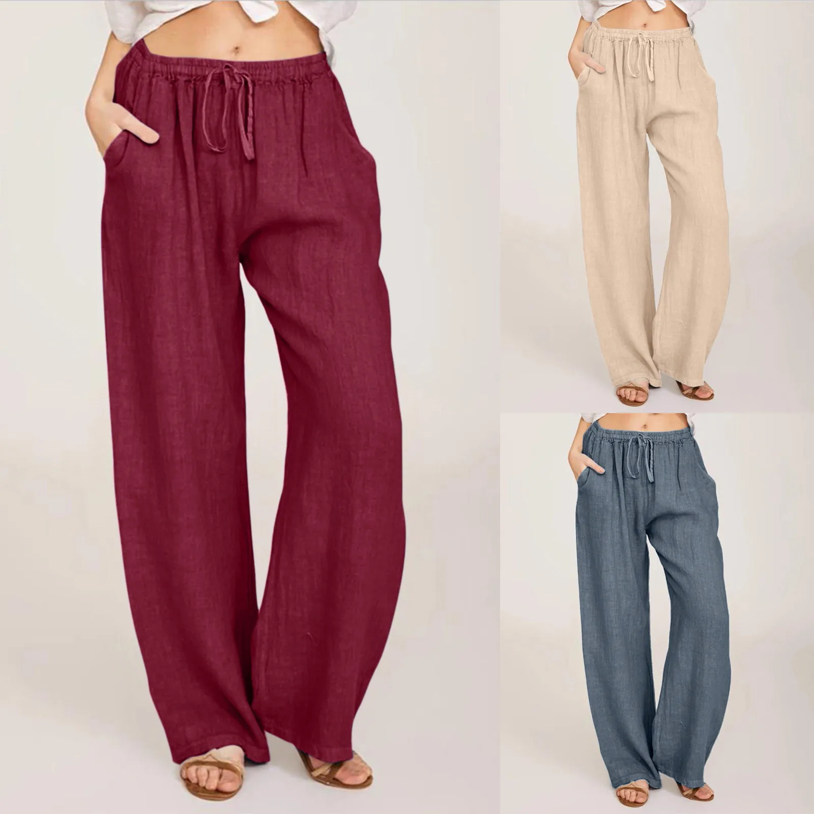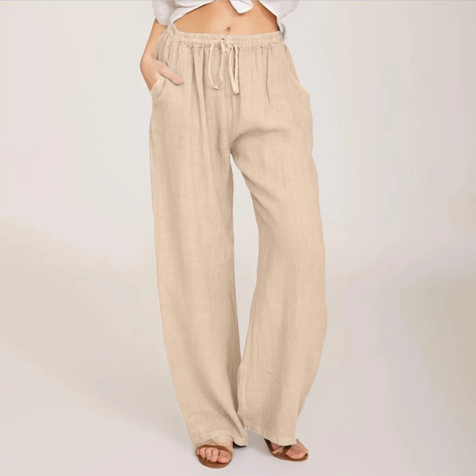 Women‘s Casual Solid Color Long Trouser Fashion Elastic Waist Pocket Long Pants For Women Soft Drawstring Wide Leg Long Pants