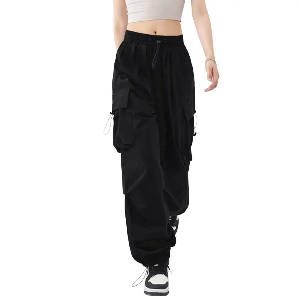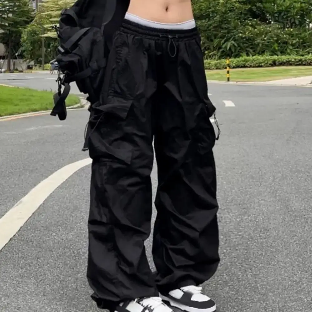 Street Style Cargo Pants Elastic Waist Adjustable Drawstring Long Trousers Solid Color Wide Leg Loose Fit Casual Pants 작업복 바지