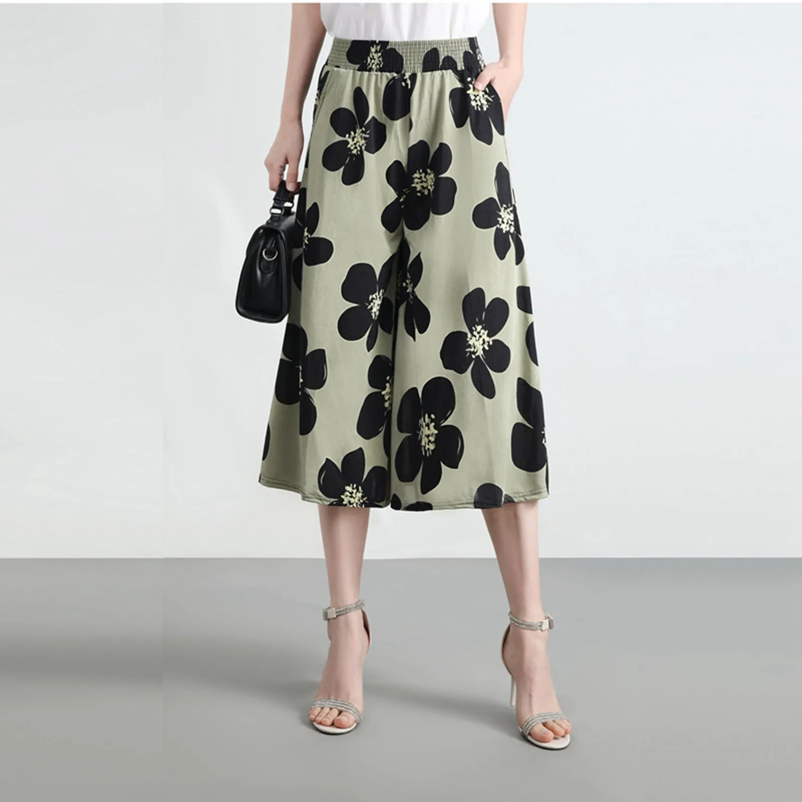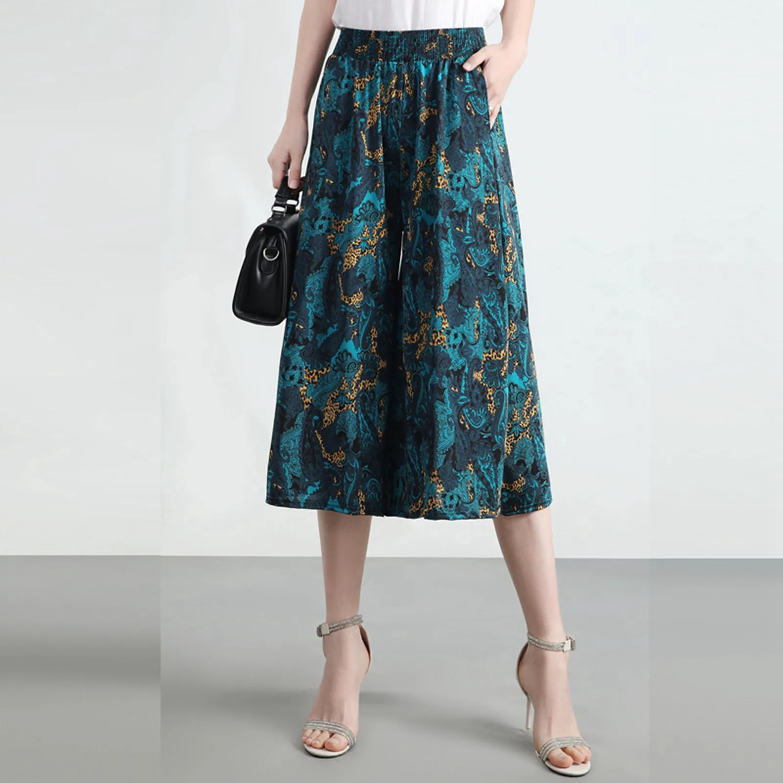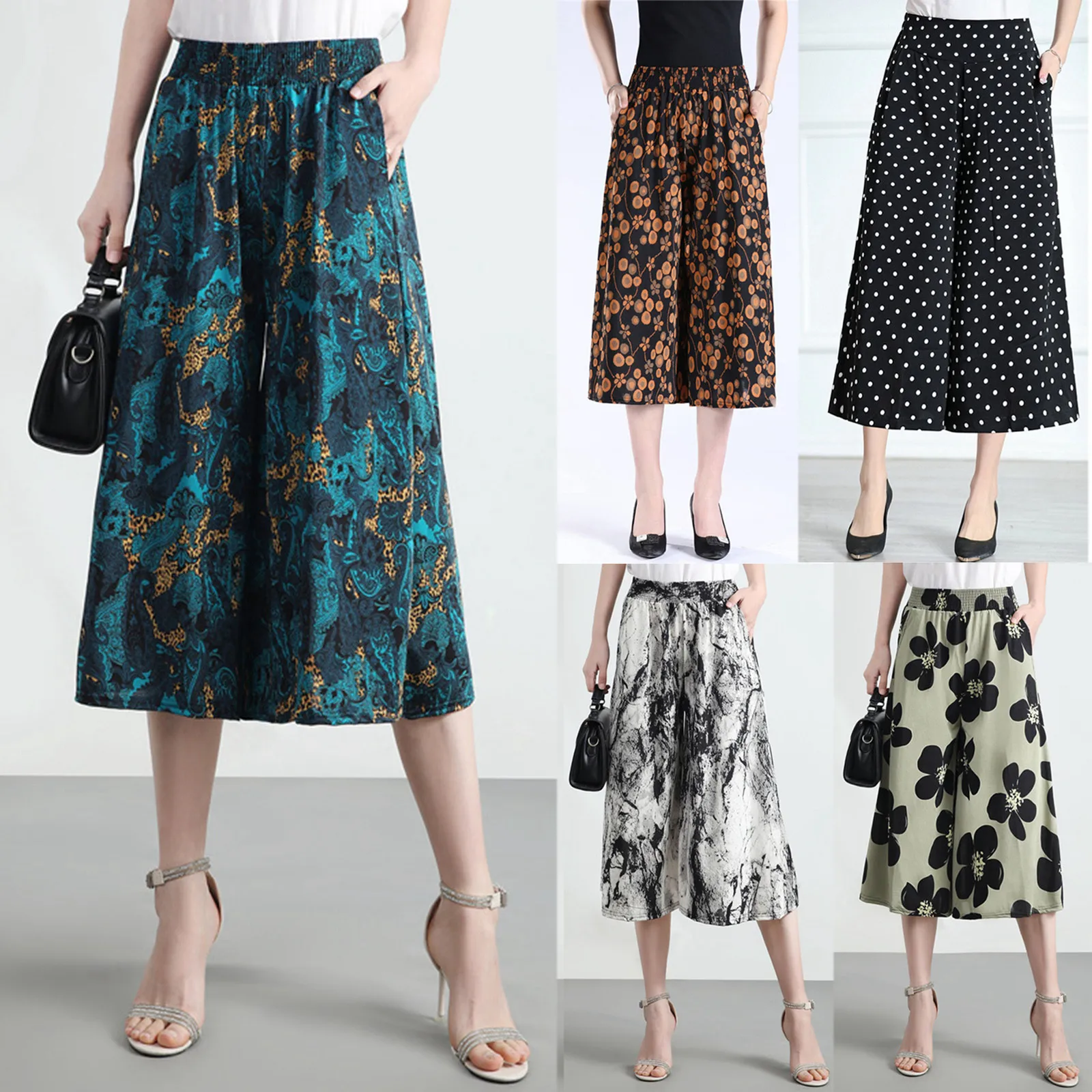 Women's Fashionable Printed Elastic Waist Thin Wide Leg Pants High Waisted Skirt Pants Lady Apparel Womens Work Trousers